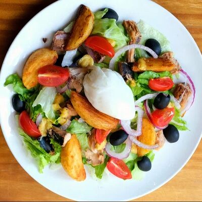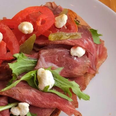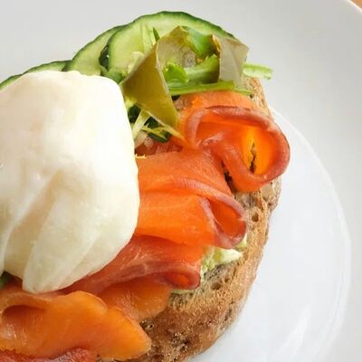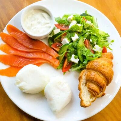 Яйцо куриное, сыр страчателла, форель слабосоленая, лист салата, руккола, помидоры черри, багет сырный, фирменный соус
