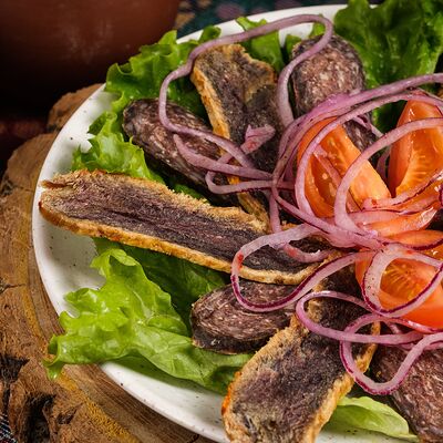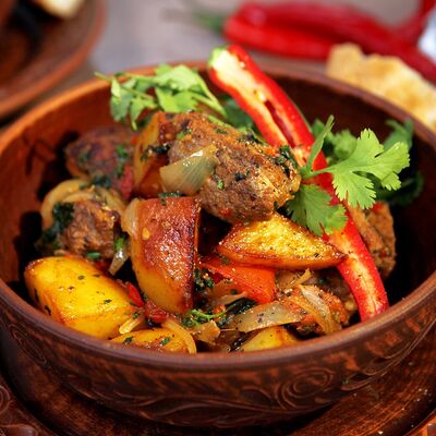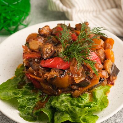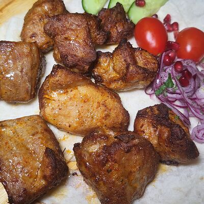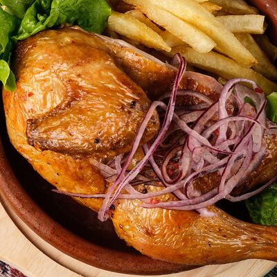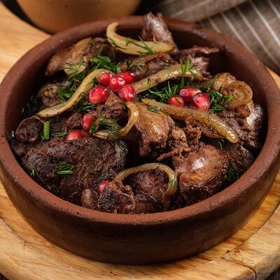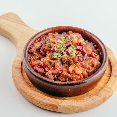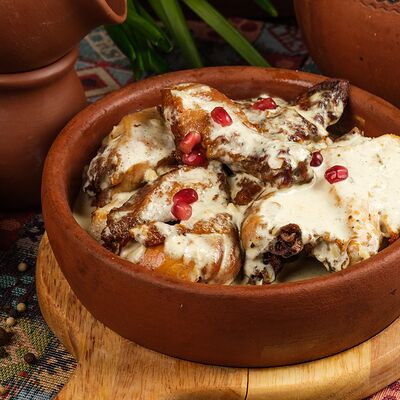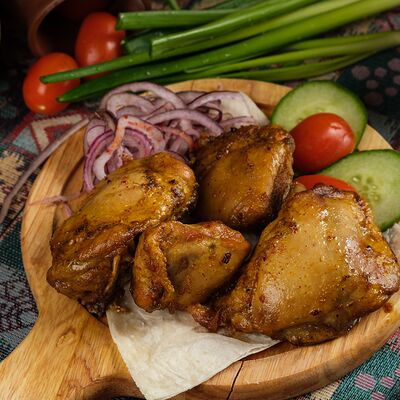 Кусочки цыпленка, тушенные в густом томатном соусе с чесноком и пряностями
