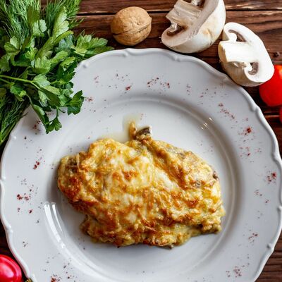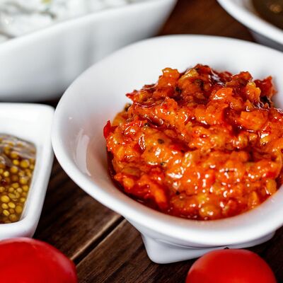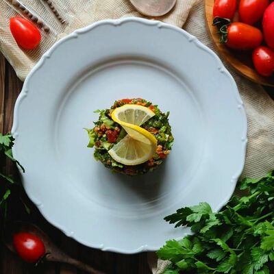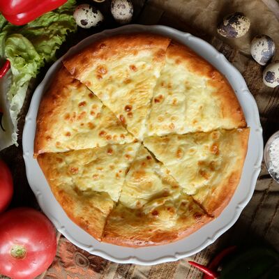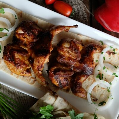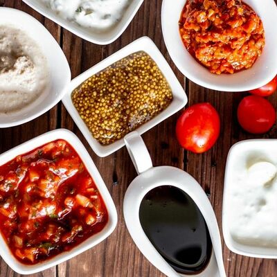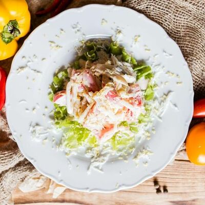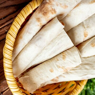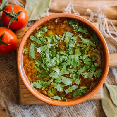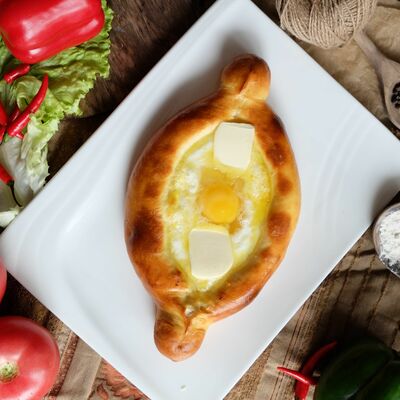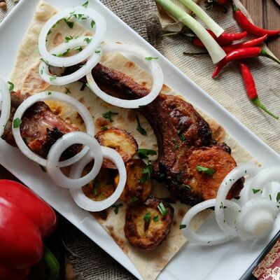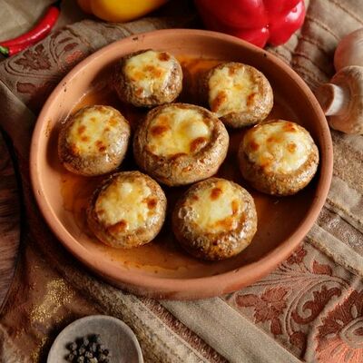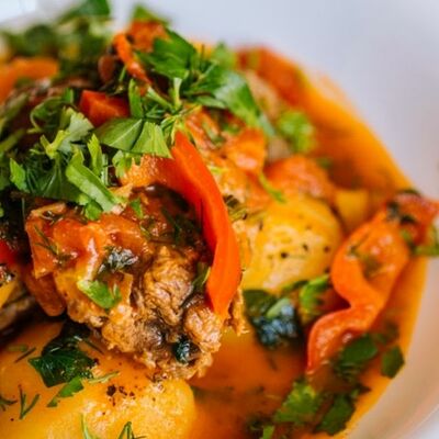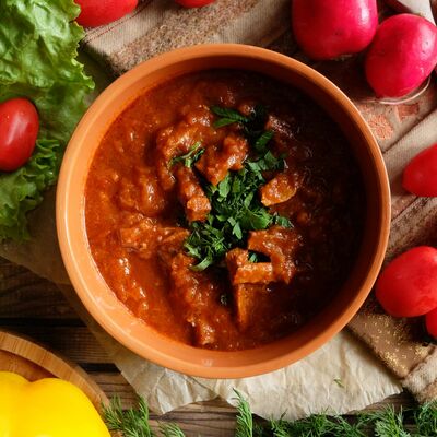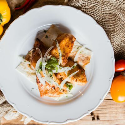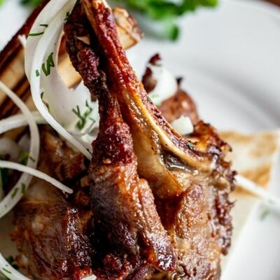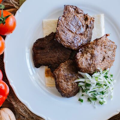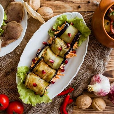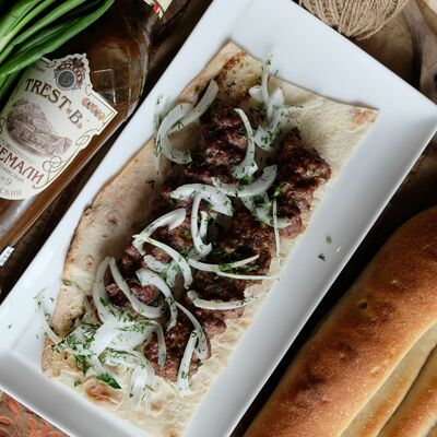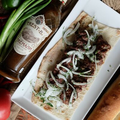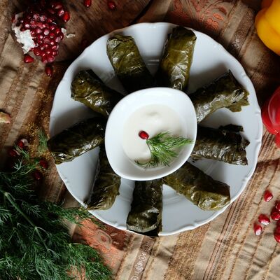 Винoградный лист, фарш из говядины и свинины с рисом, соус мацун с чесноком
