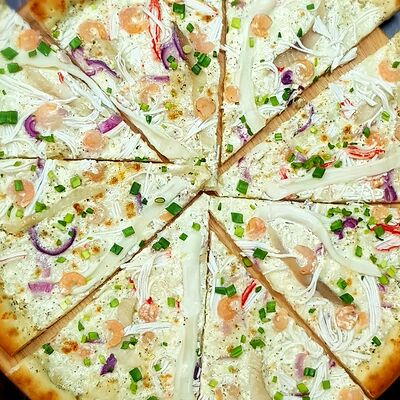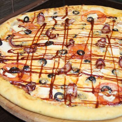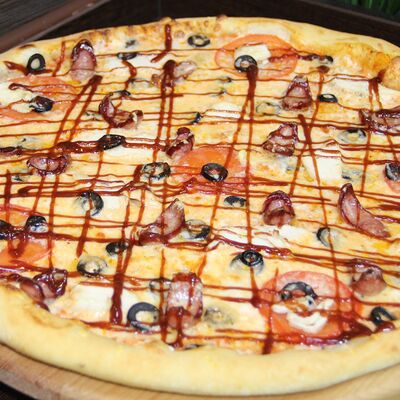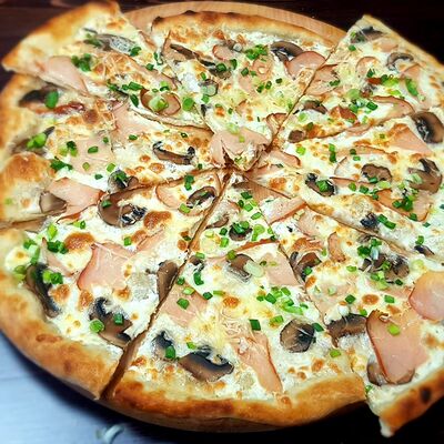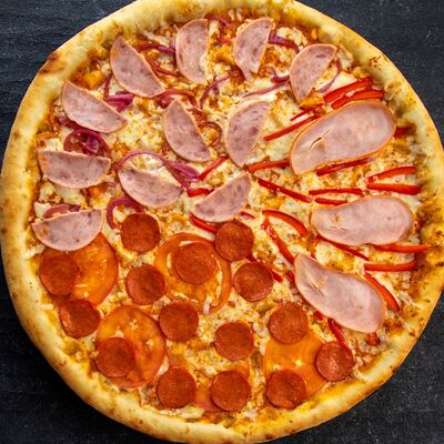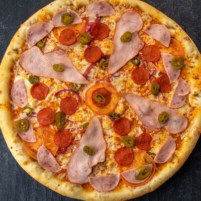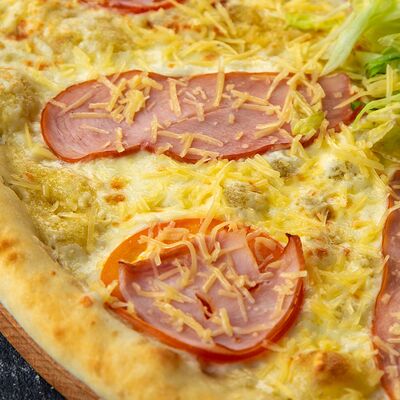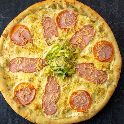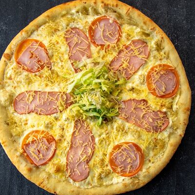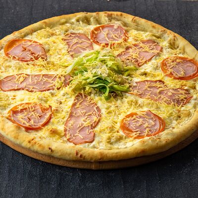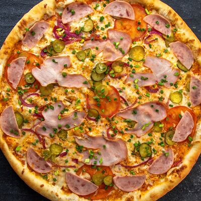 Ветчина, копченая грудка, маринованные огурцы, маринованный лук, зеленый лук, томаты, сыр Моцарелла, томатный соус, майонез (25 см)