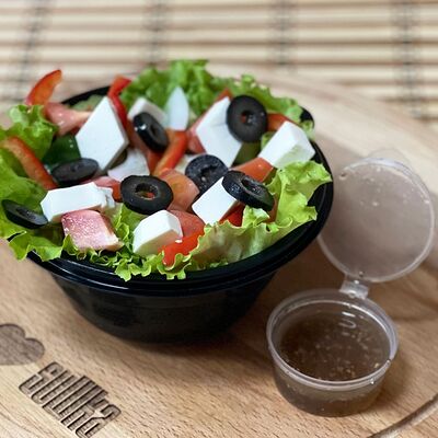 Лист салата, помидор, огурец, сладкий перец, маринованный лук, фетакса, маслины, соус