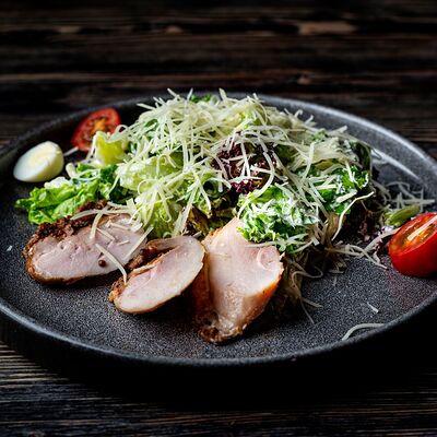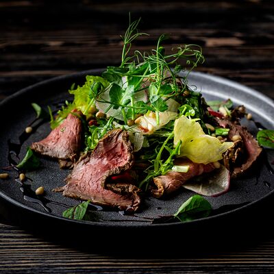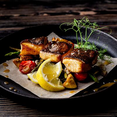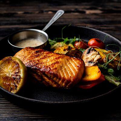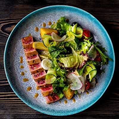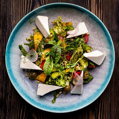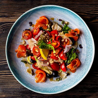 Микс салатов, помидорки черри, семга собственного посола, филе малосоленого палтуса, маслины, редис, лимон, кедровый орех, соус лимонный