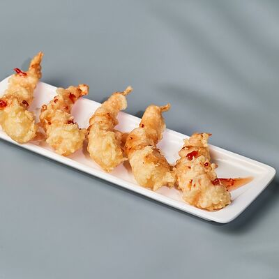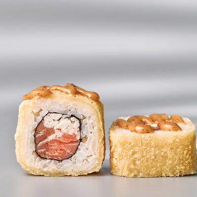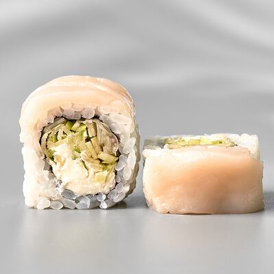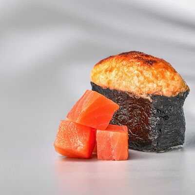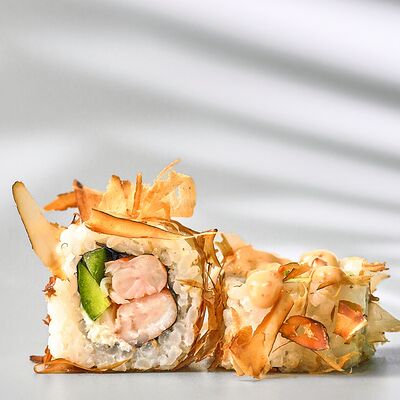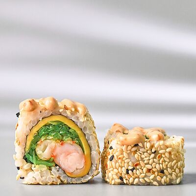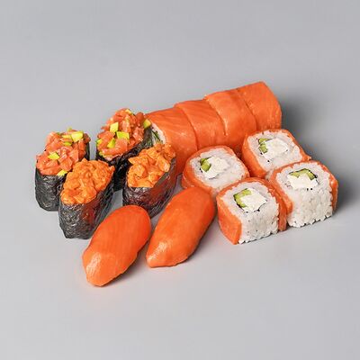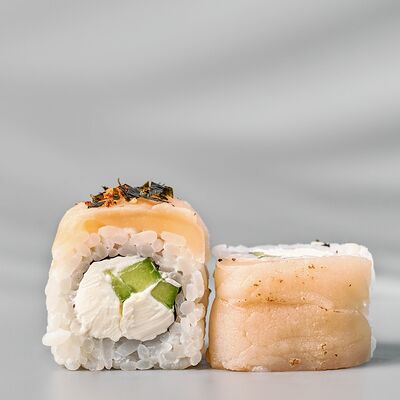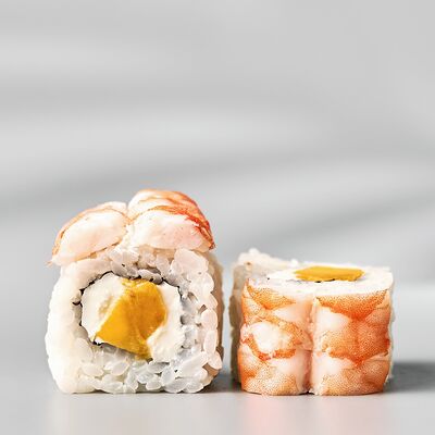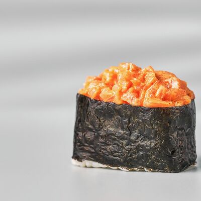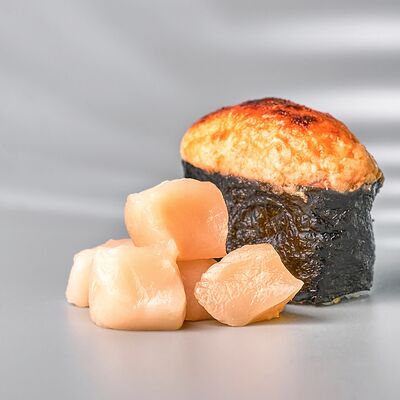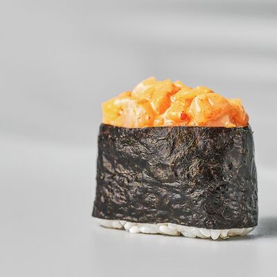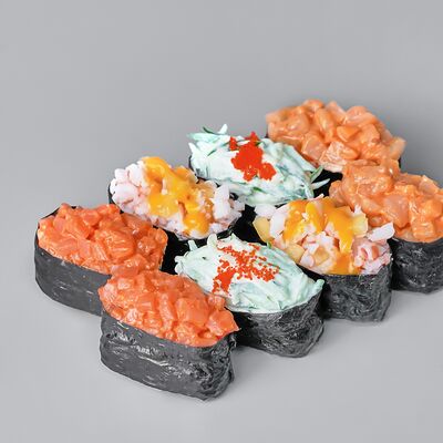 Гункан с креветкой, гункан с огурцом, гункан Гребешок спайси, гункан Лосось спайси (8 шт.). Соус, васаби и имбирь не входят в набор
