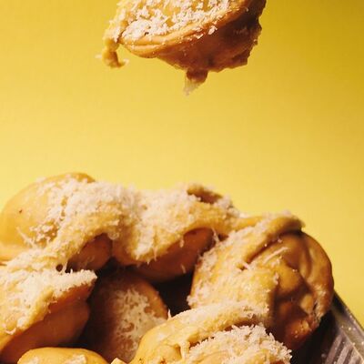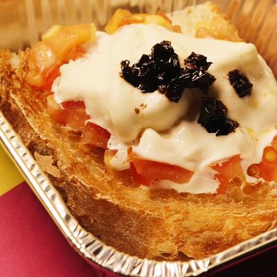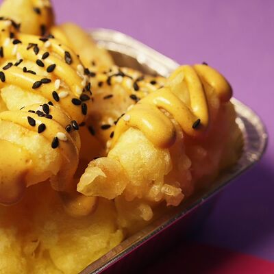 Обжаренные во фритюре тигровые креветки в кляре (на основе рисовой муки), с соусом кимчи и миксом кунжута