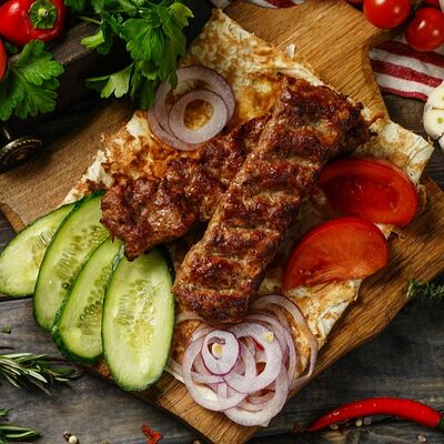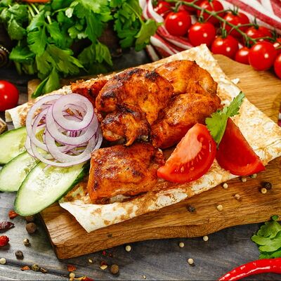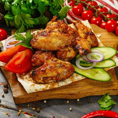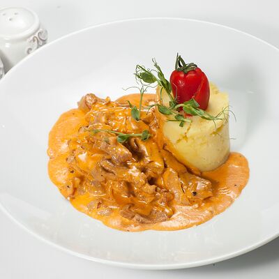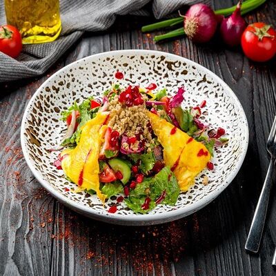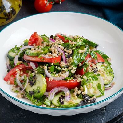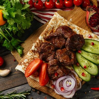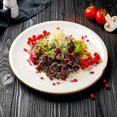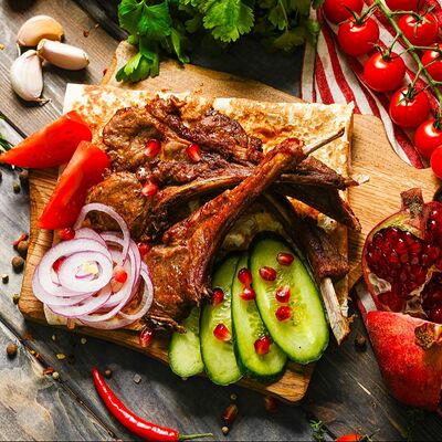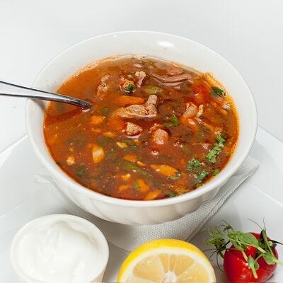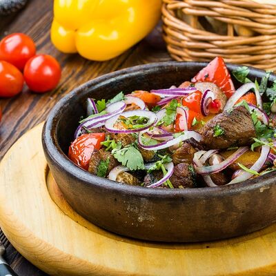 Свинина, помидоры свежие, лук репчатый, картофель, зелень, перец болгарский