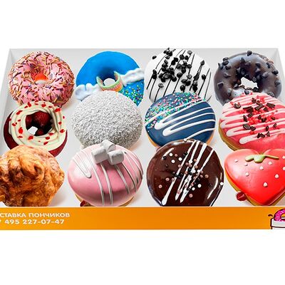 Собери любимые вкусы донатов из ассортимента. Пончиковое тесто (мука, смесь донат микс, масло подсолнечное, вода), начинки: кокосовый крем, вишневый джем, чернично-творожный крем, яблочный конфитюр, клубнично-творожный крем, творожный крем, банановый кремфил, заварной крем, земляничный джем, шоколадный кремфил, фисташковый кремфил, миндальный кремфил. Посыпка: сахарная помадка, глазурь (3 шт.)