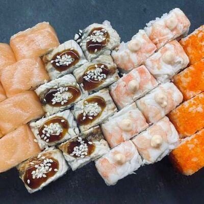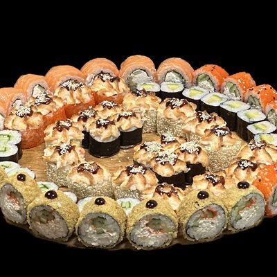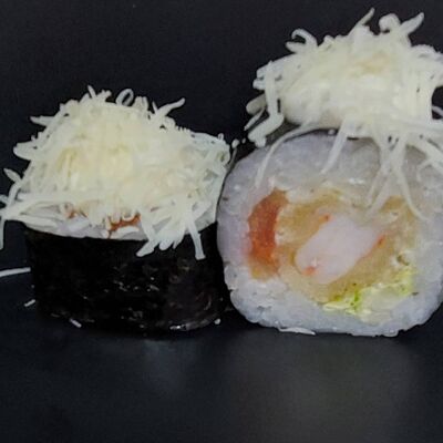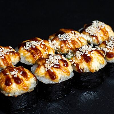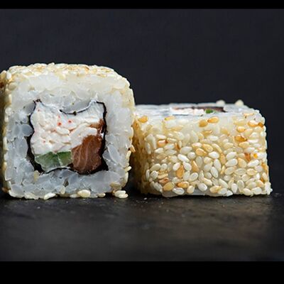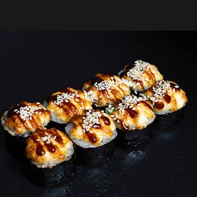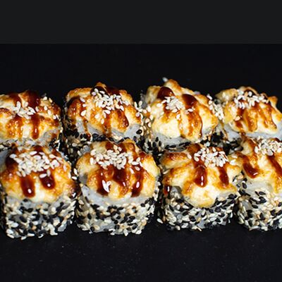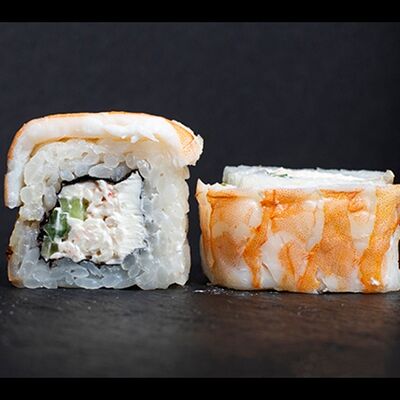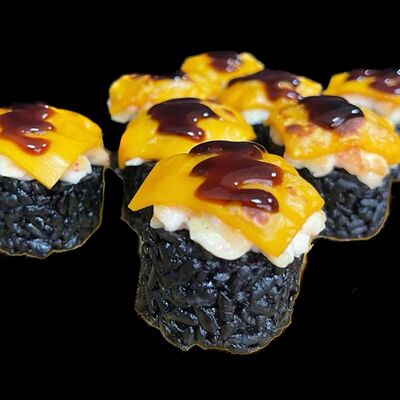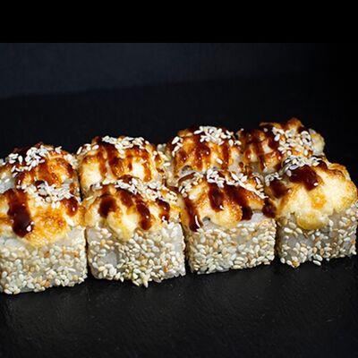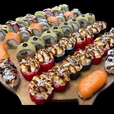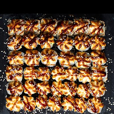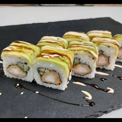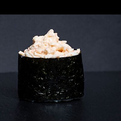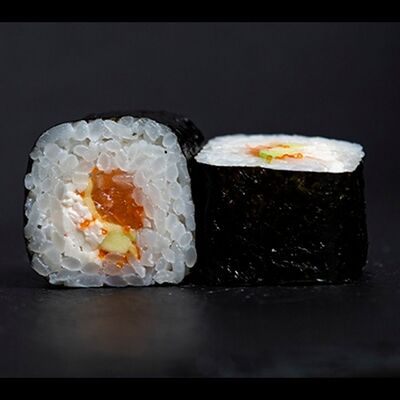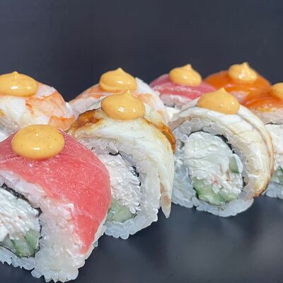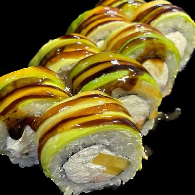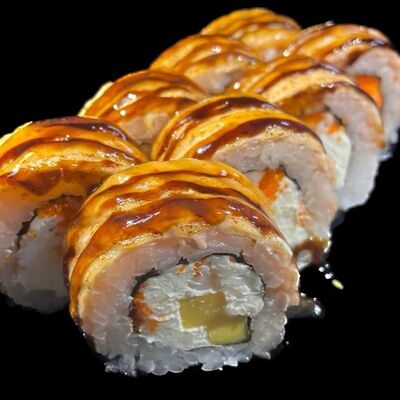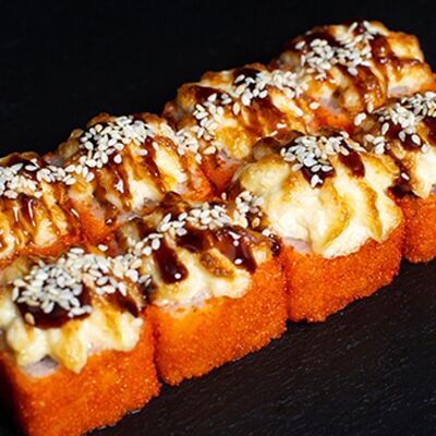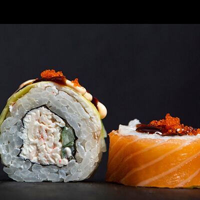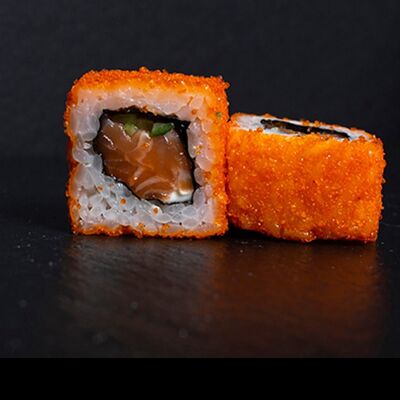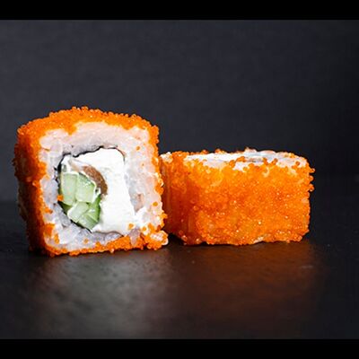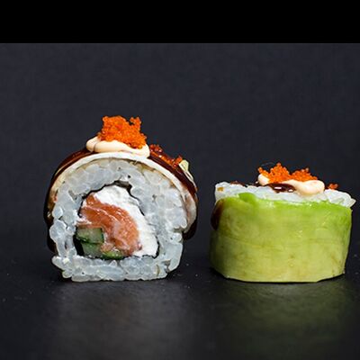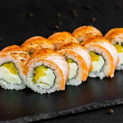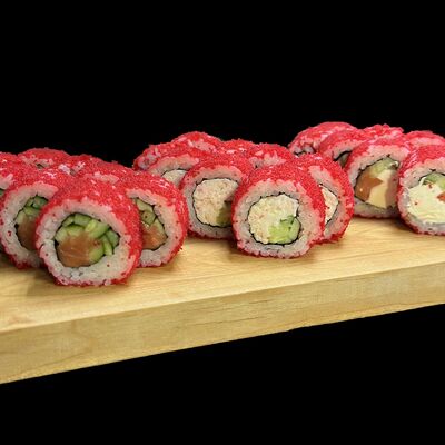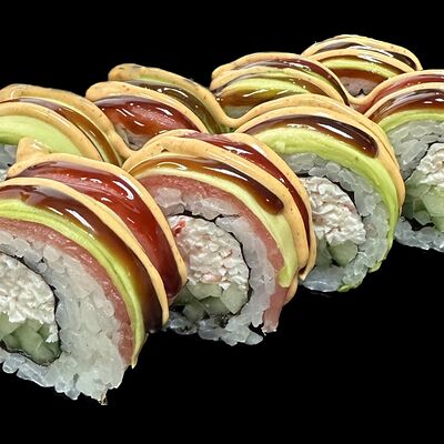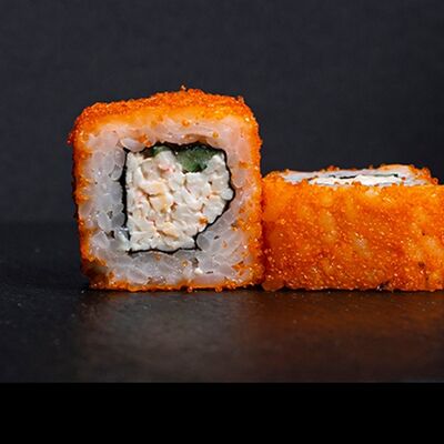 Авокадо, лосось, краб-микс, икра тобико, соус спайси