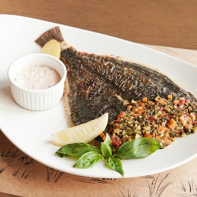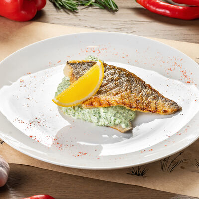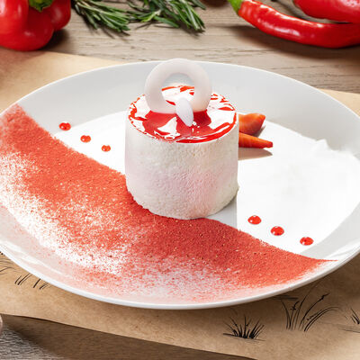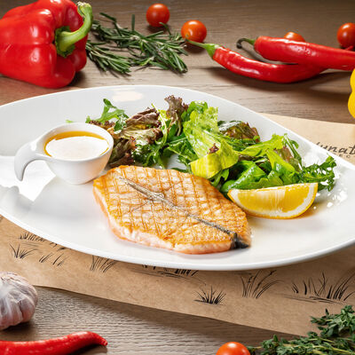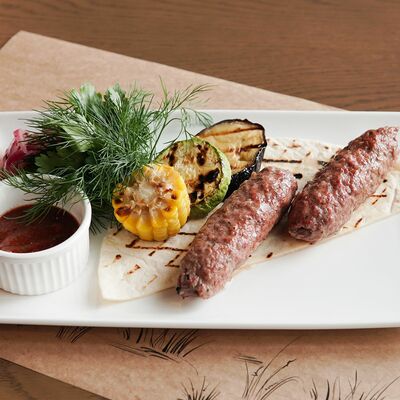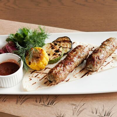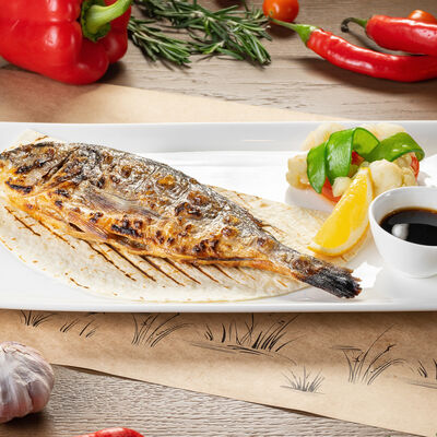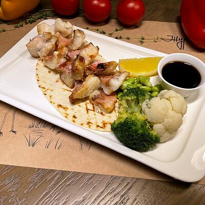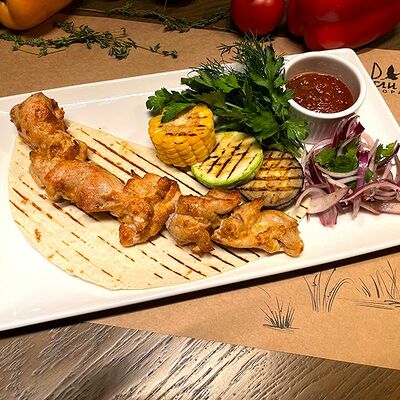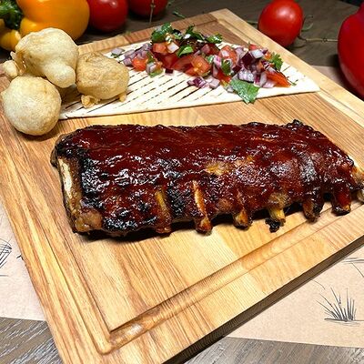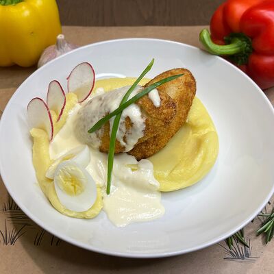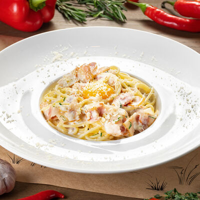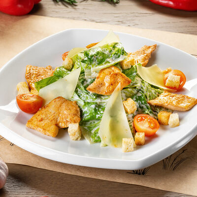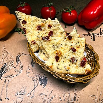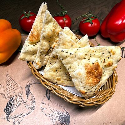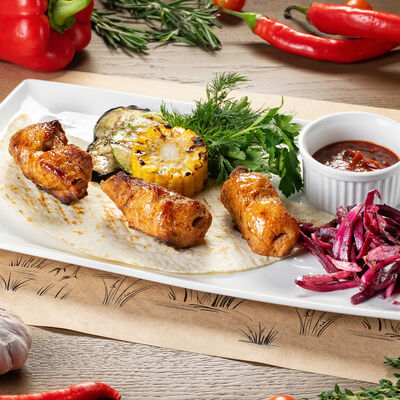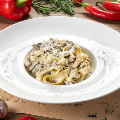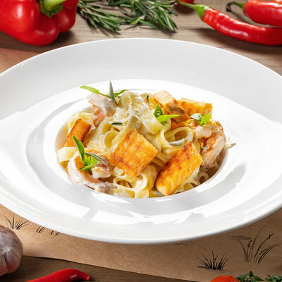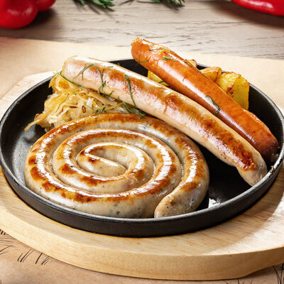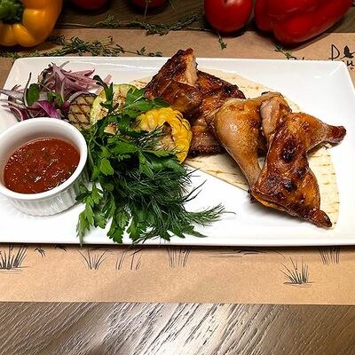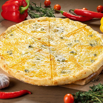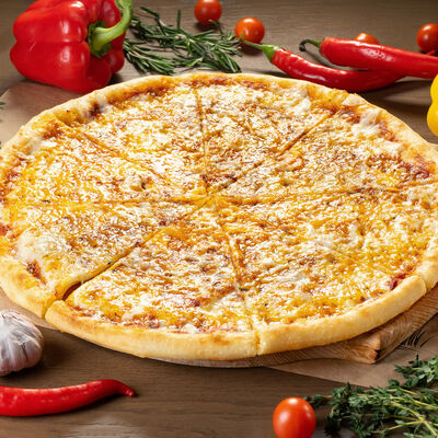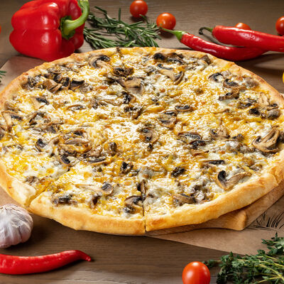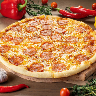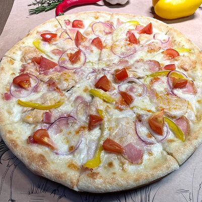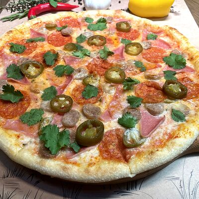 Белое тесто, соус томатный, ветчина из индейки, колбаса пепперони, колбаска куриная, сыр моцарелла, соус барбекю, перец халапеньо, кинза (30 см)