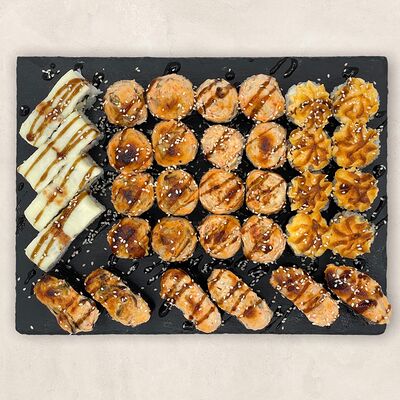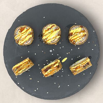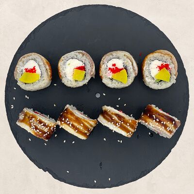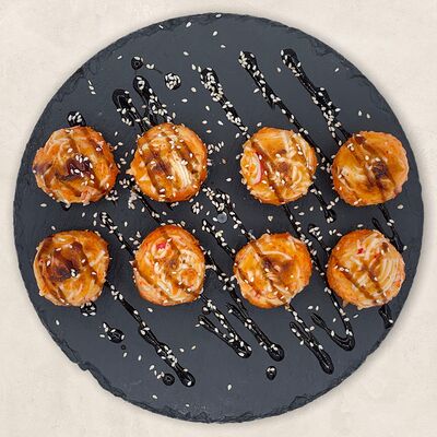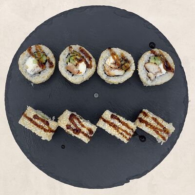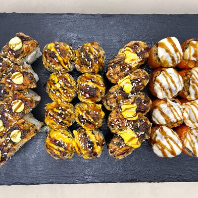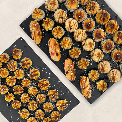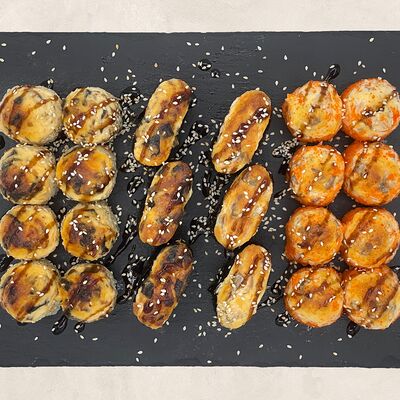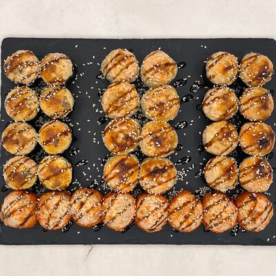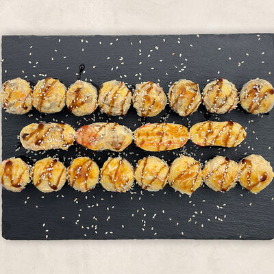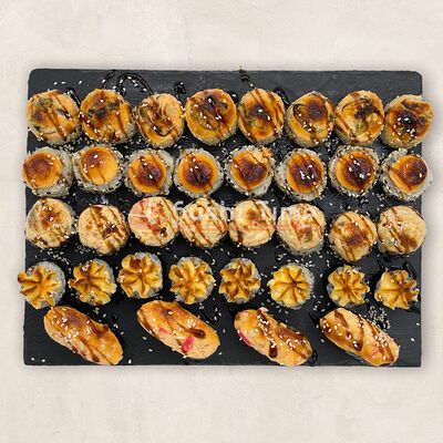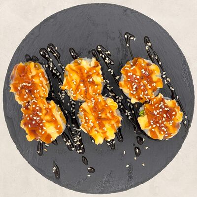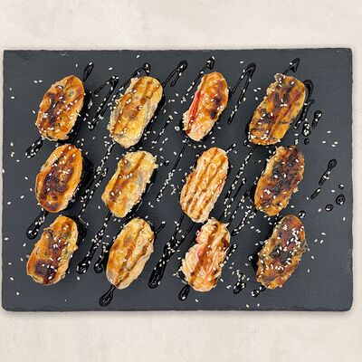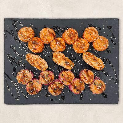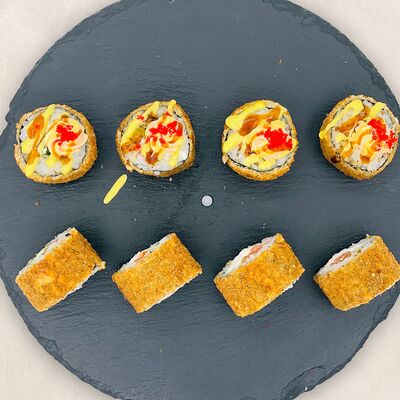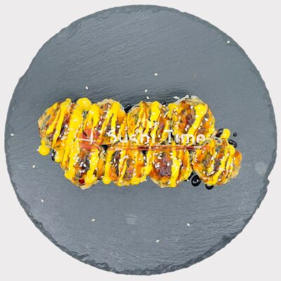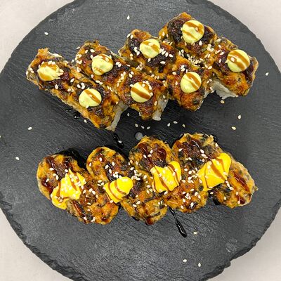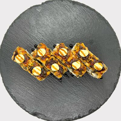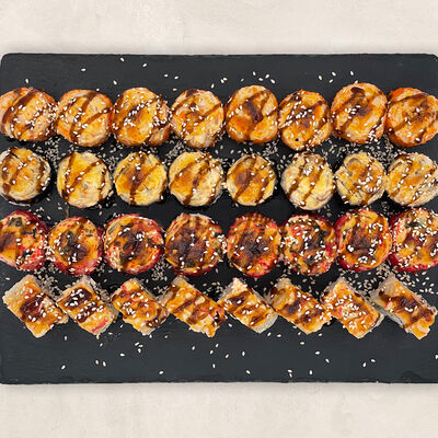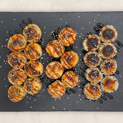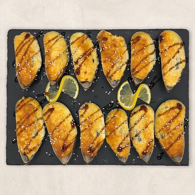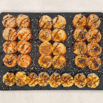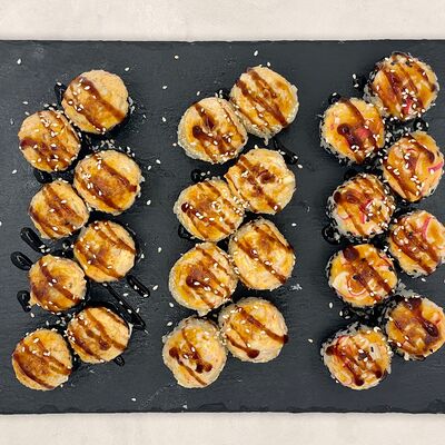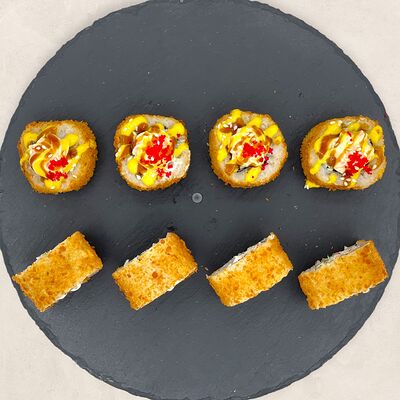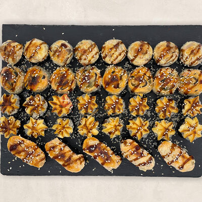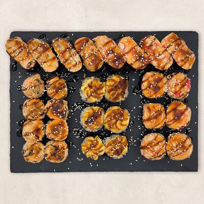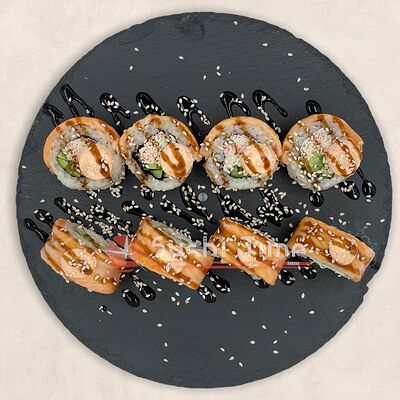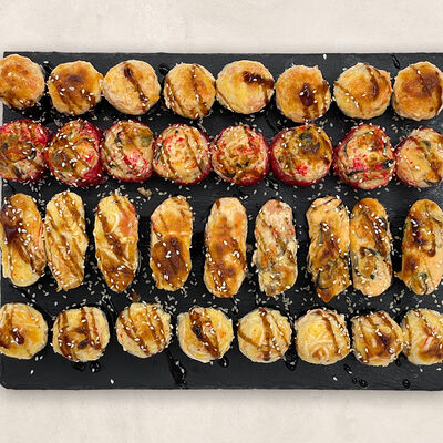Запеченный ролл с мидиями, Запеченный ролл с окунем, Ролл Спайси, Запеченный мини с омлетом, запеченные суши с крабом (4 шт.)