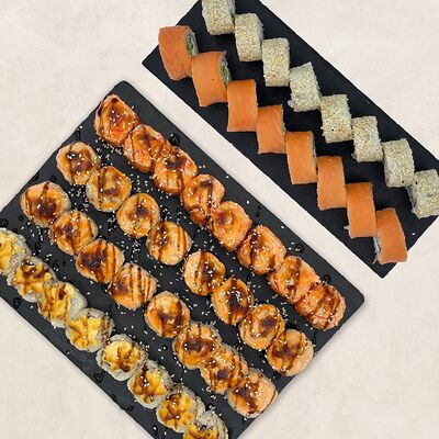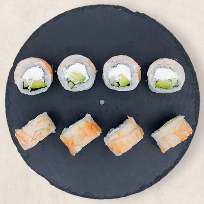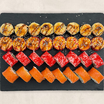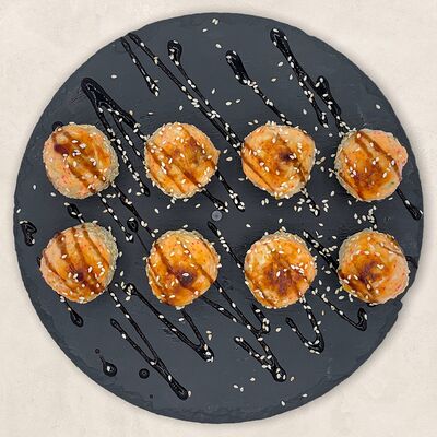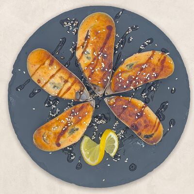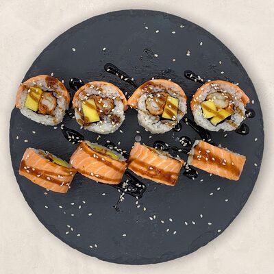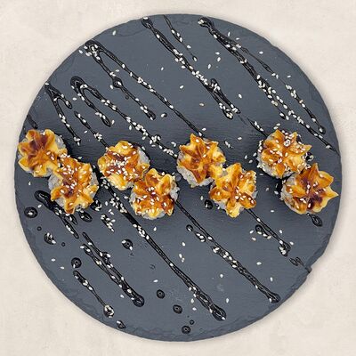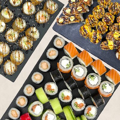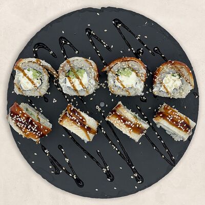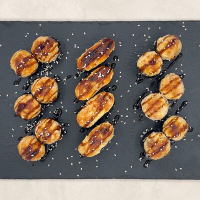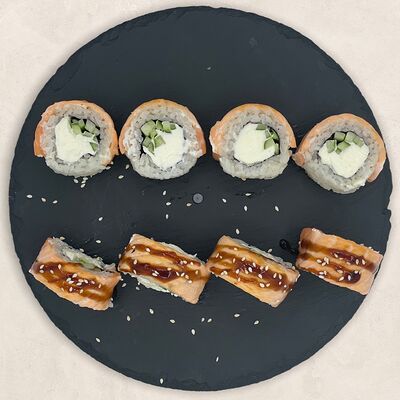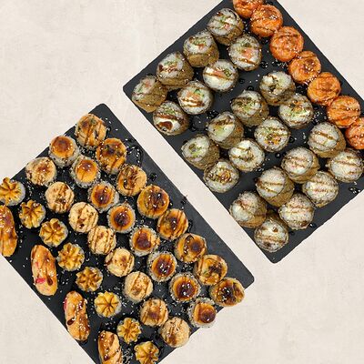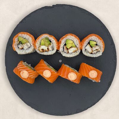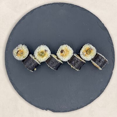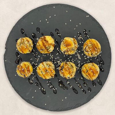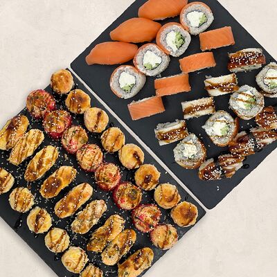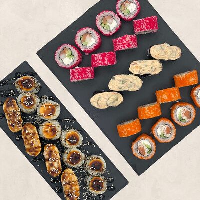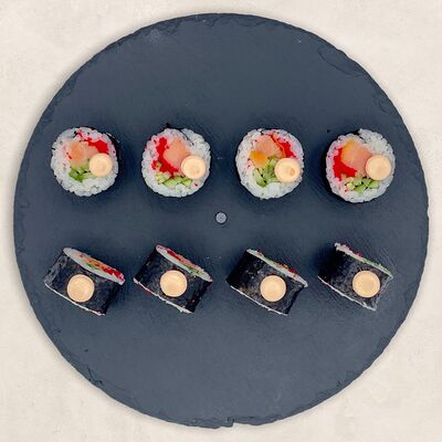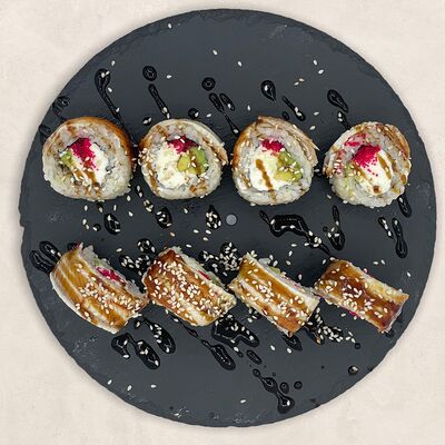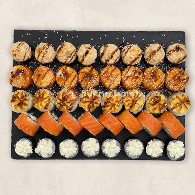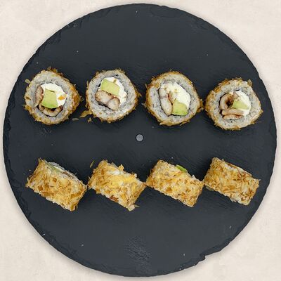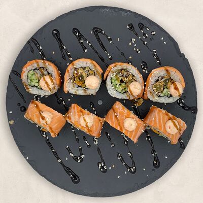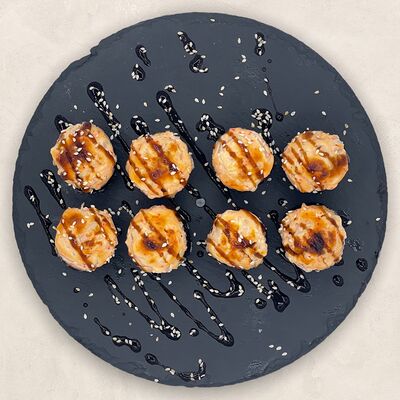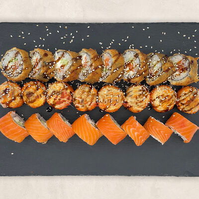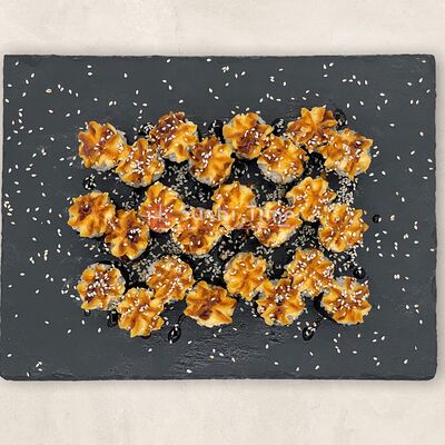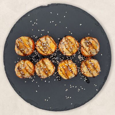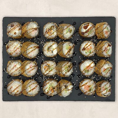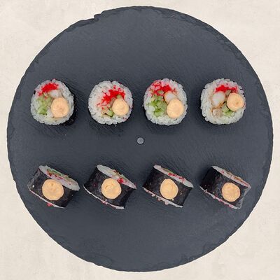 Запеченный ролл с мидиями, Запеченный ролл с окунем, Ролл Спайси, Запеченный мини с омлетом, запеченные суши с крабом (4 шт.)