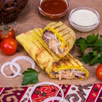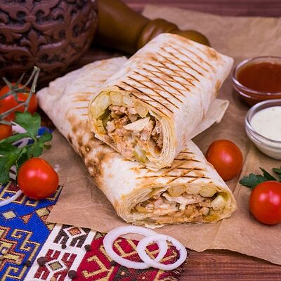 Лаваш армянский, курица, картофель фри, соленый огурец, лук, зелень, соус