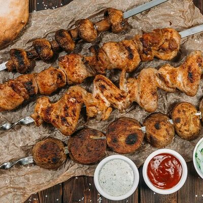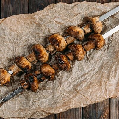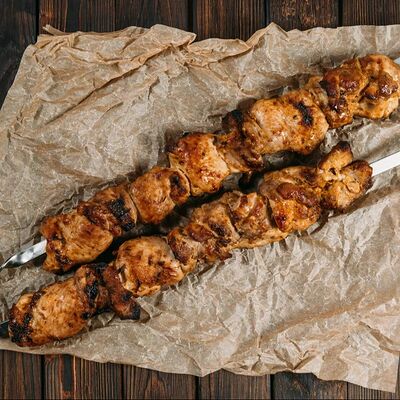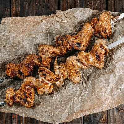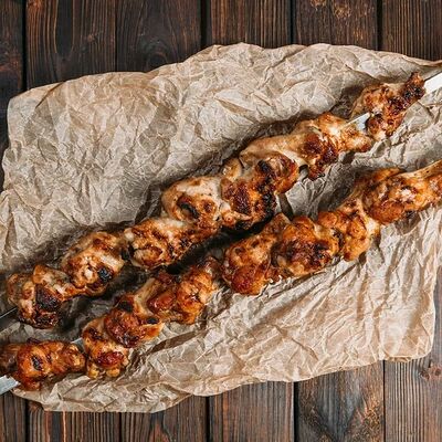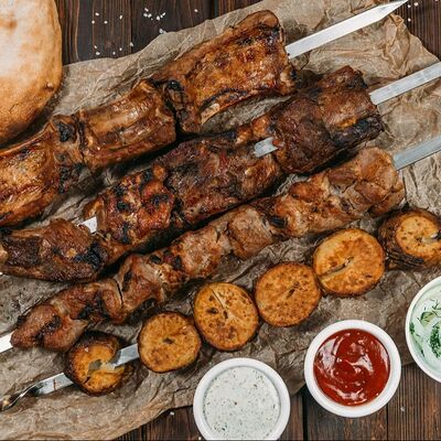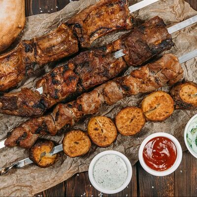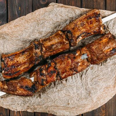 Три аппетитных мясистых свиных рёбрышка, обжаренных на раскалённых углях