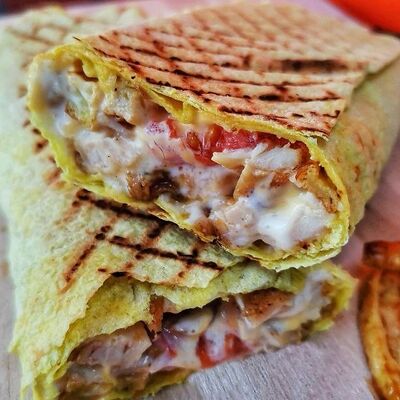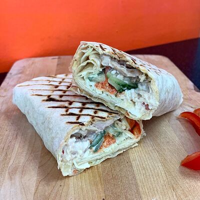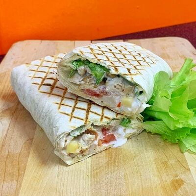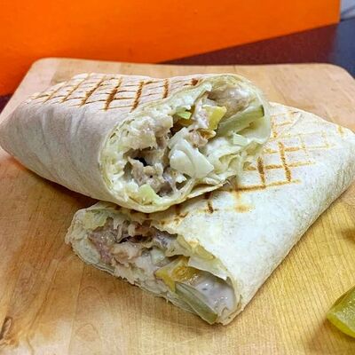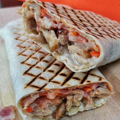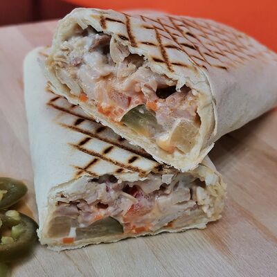 Лаваш, жареная курочка, сладкий перец, свежий огурчик, капуста, морковка по-корейски, лук, фирменный соус