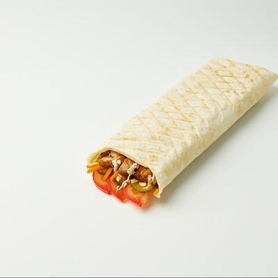 Ароматный куриный шашлык, лаваш, фирменный соус, картофель фри, бекон, соус барбекю, маринованный огурец, свежий помидор, капуста, лук фри