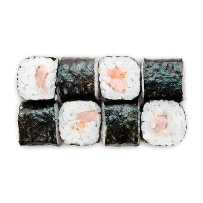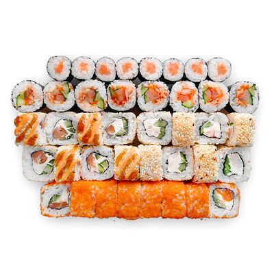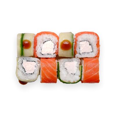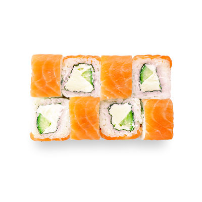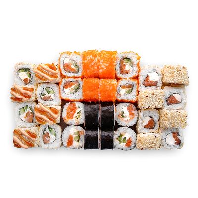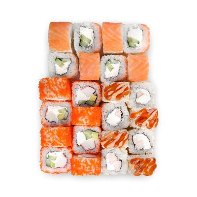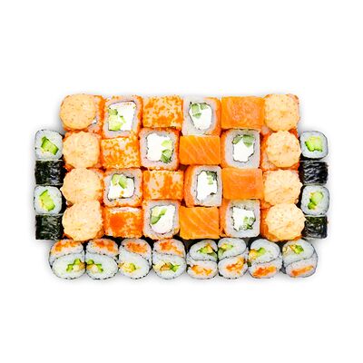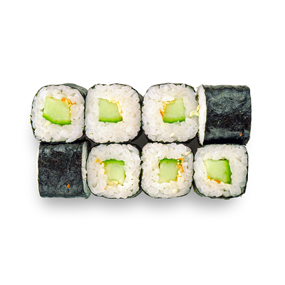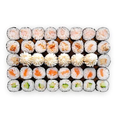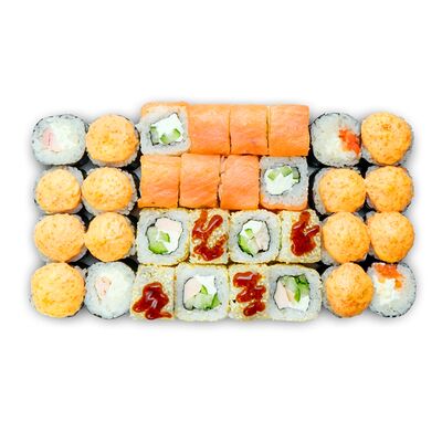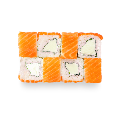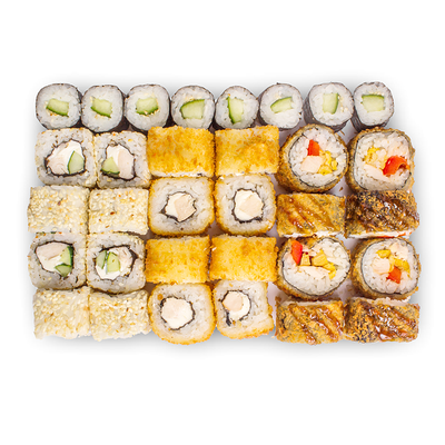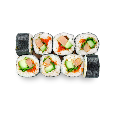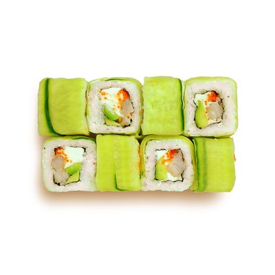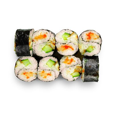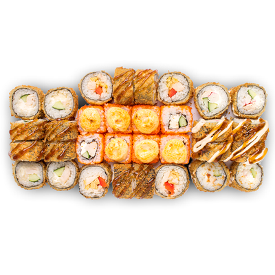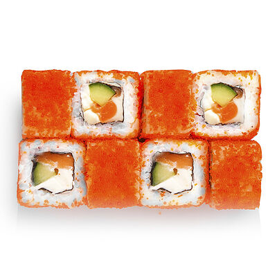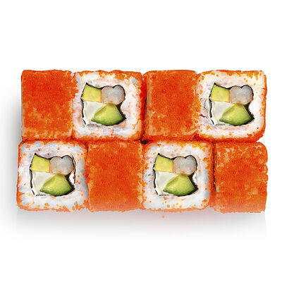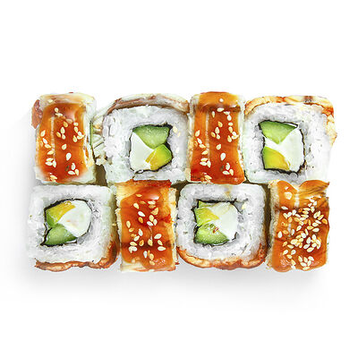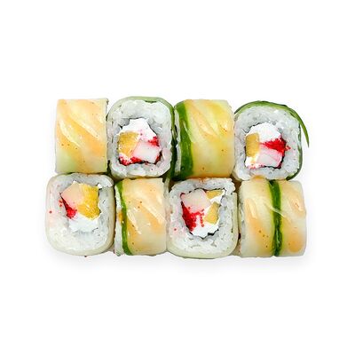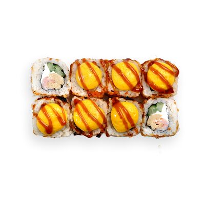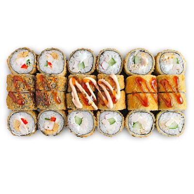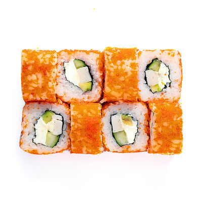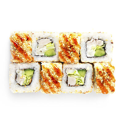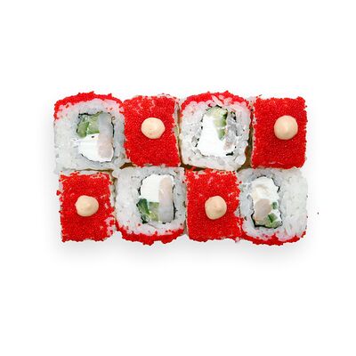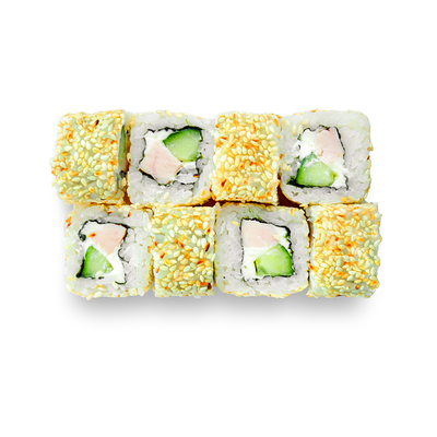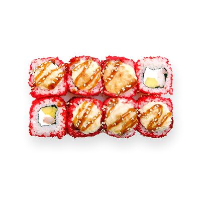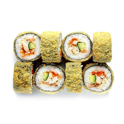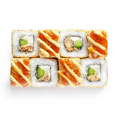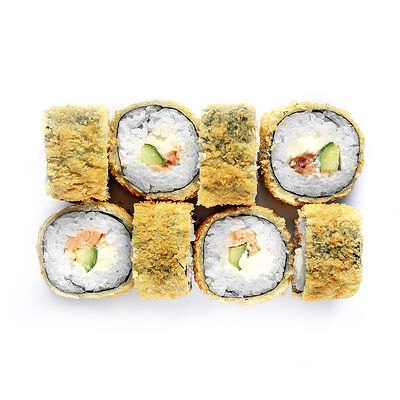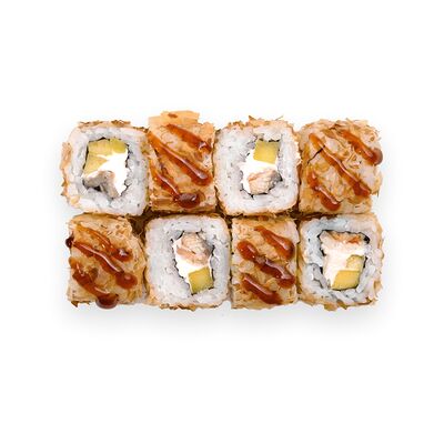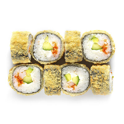 Креветки, сливочный сыр, авокадо, свежий огурец, икра масаго, соус унаги, кляр, сухари панко, рис и нори