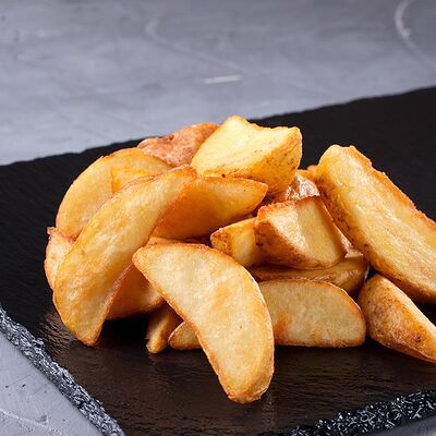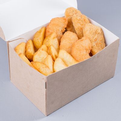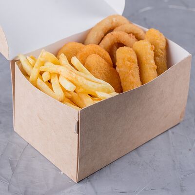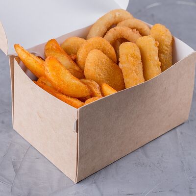 Сырные палочки (3 шт.), куриные наггетсы (3 шт.), луковые кольца (3 шт.), картофель по-деревенски (стандартная порция)