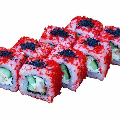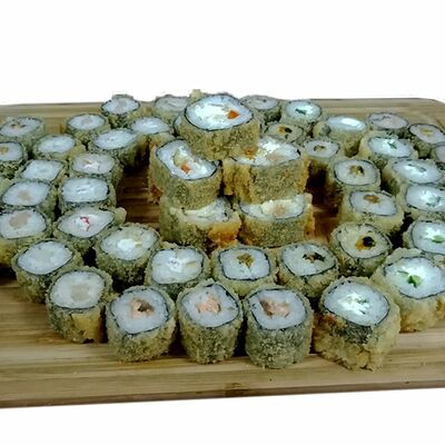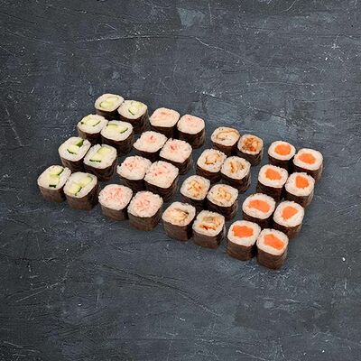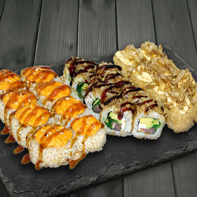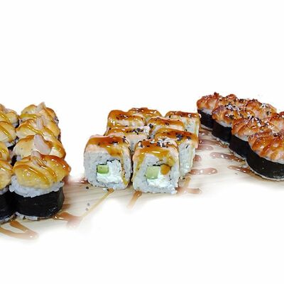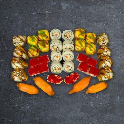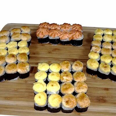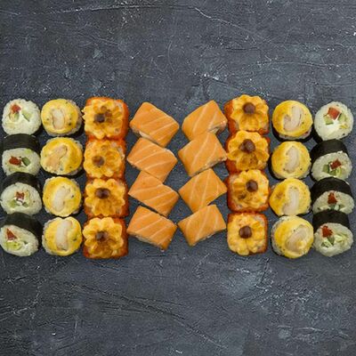 Ролл Сакура, ролл Татами, ролл Киото, ролл Самурай, нигири с лососем (4 шт.), гункан с лососем и икрой (2 шт.)