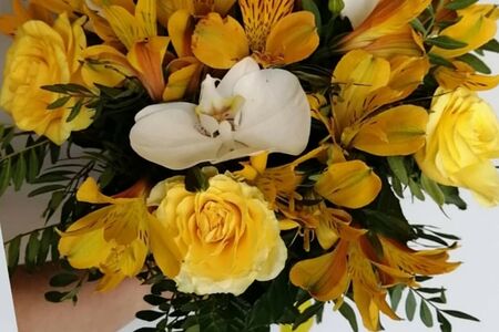 Изящный букетик-комплимент. Изысканно и со вкусом. Цвет нужно оговаривать с флористом, возможна замена на имеющиеся в наличии или по желаю выполнен в другом цвете. Указаны примерные размеры, чтобы вы могли представить внешний вид и масштаб, но фактически размеры могут немного отличаться.