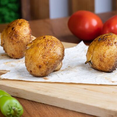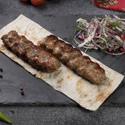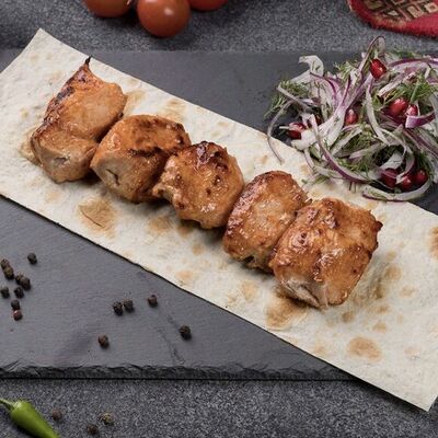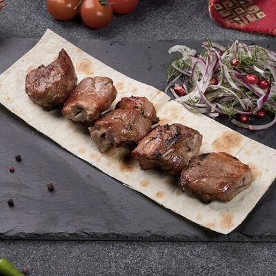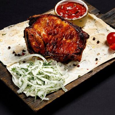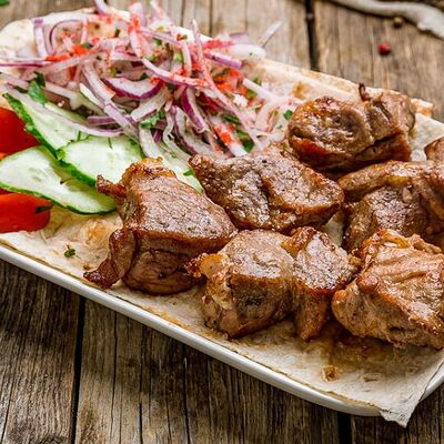 Подается с картошкой, лепешкой, соусом и луком