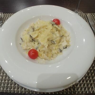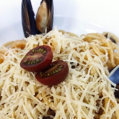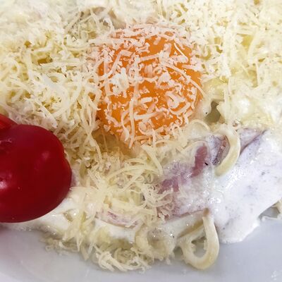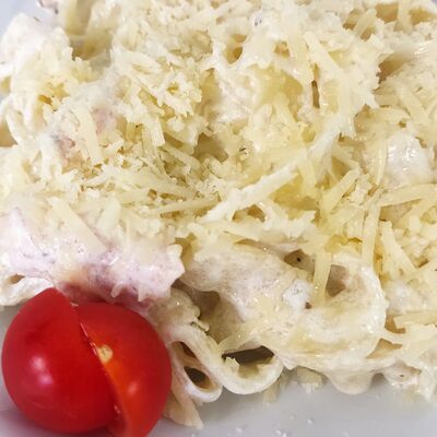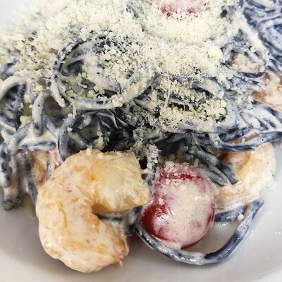 Спагетти, сливки, креветки, пармезан, томаты черри