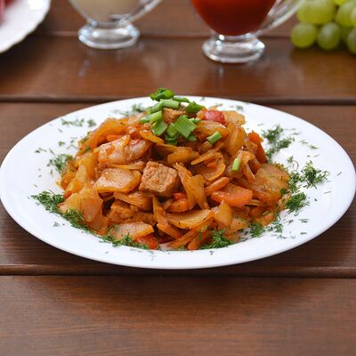 Говяжий бульон, морковь, говядина, лук репчатый, рис, томат, чеснок, красный перец, перец болгарский, кинза, масло растительное, соль, перец, зелень