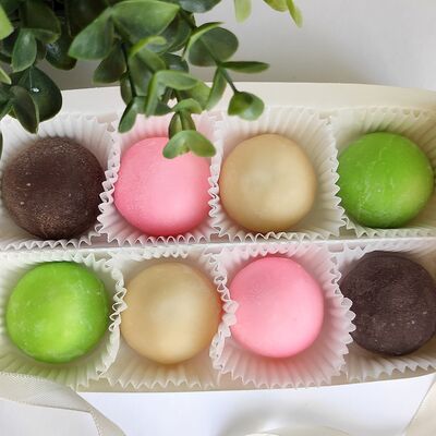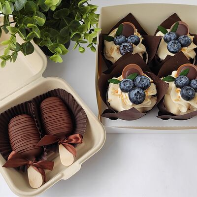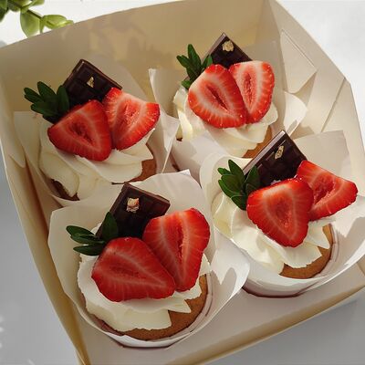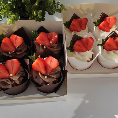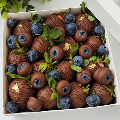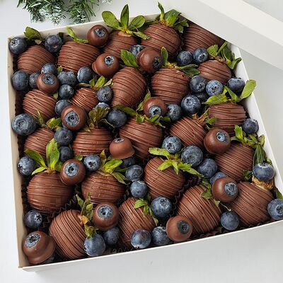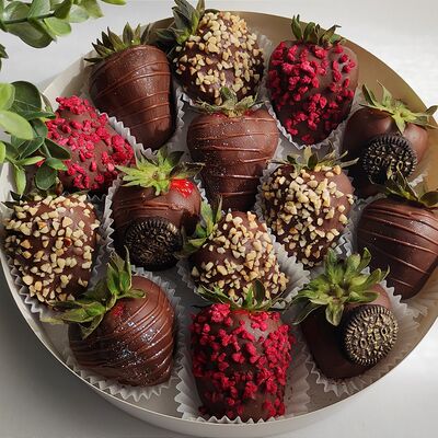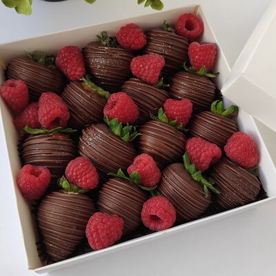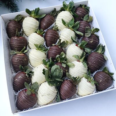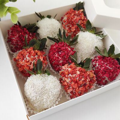 В наборе 9-12 ягод клубники (количество зависит от размера ягод). Топпинги: сублимированные ягоды малины, клубники, кокосовая стружка. Размер коробки 15×15×4 см. Срок хранения: 12 часов в холодильнике при температуре от 2 до 6