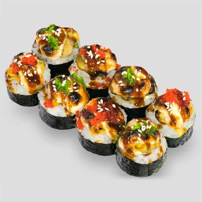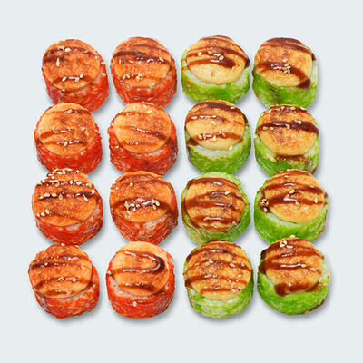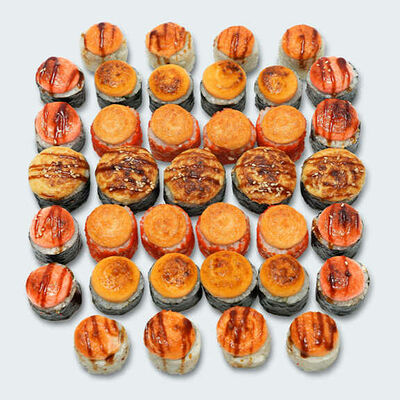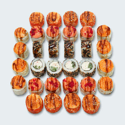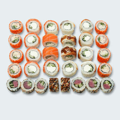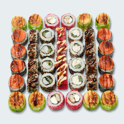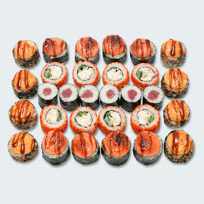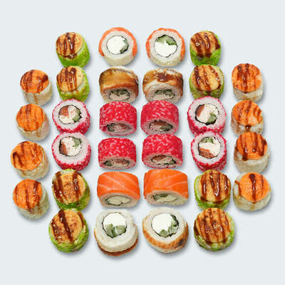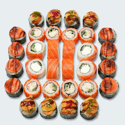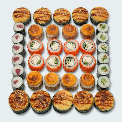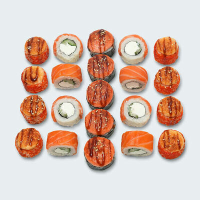 Филадельфия, Канада с сыром, Острый с тунцом, Калифорния в икре. Подается с соевым соусом (60 г), имбирем (30 г), васаби (10 г)