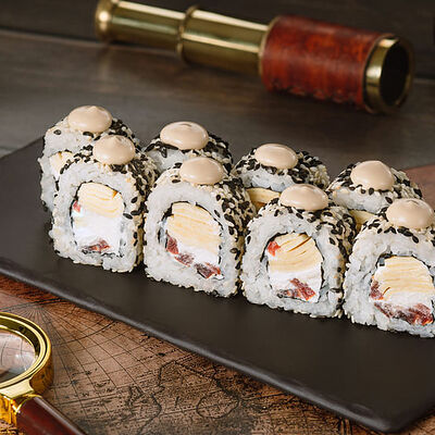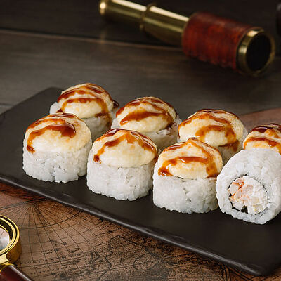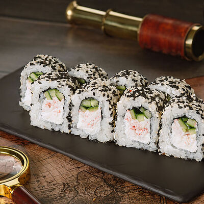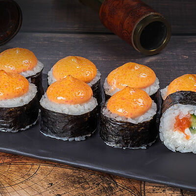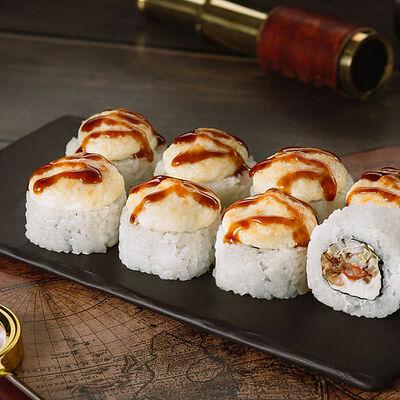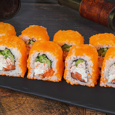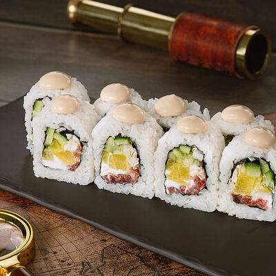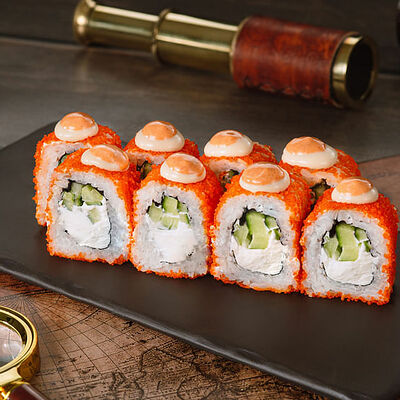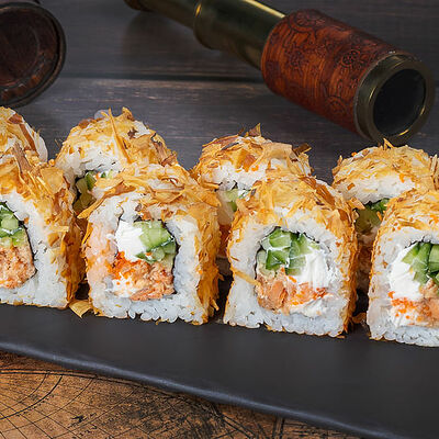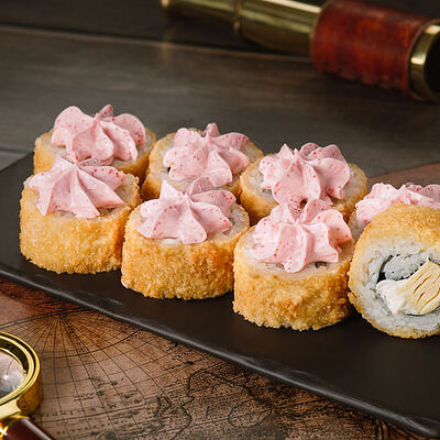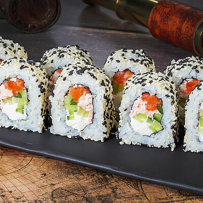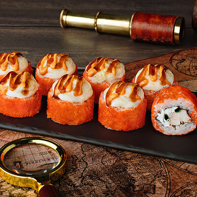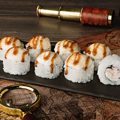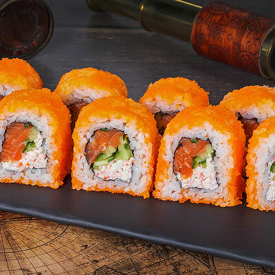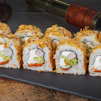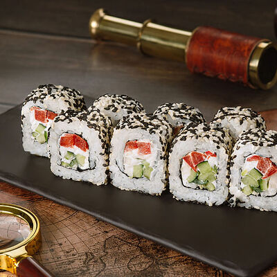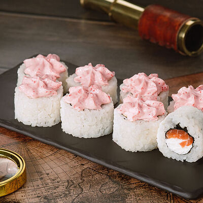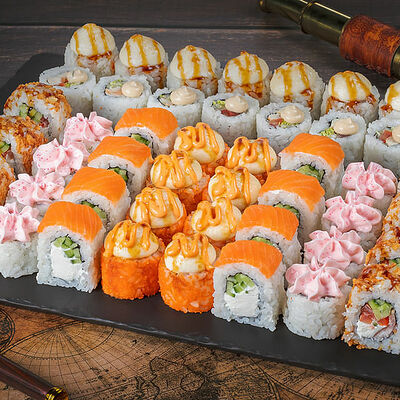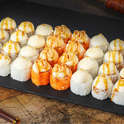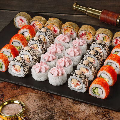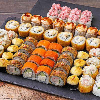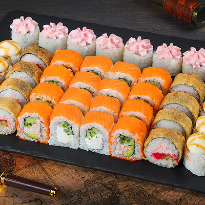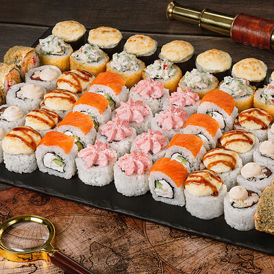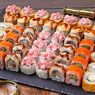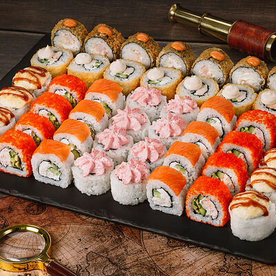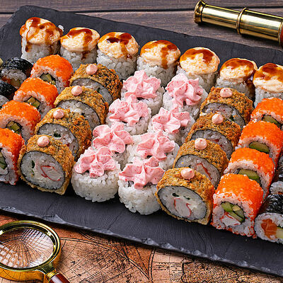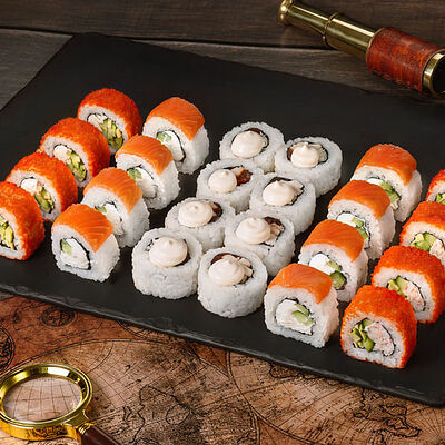 Фудзияма с крабом 8шт, Филадельфия Лайт 8шт, Кентукки 8шт, Монтана 8шт, Мексиканская цыпа 8шт, Курочка из Сакурасо 8шт. Не забудьте заказать имбирь, васаби и соевый соус. Они не входят в стоимость заказа