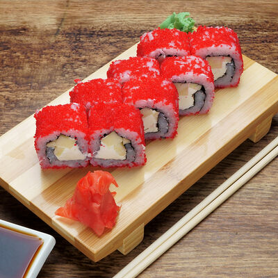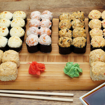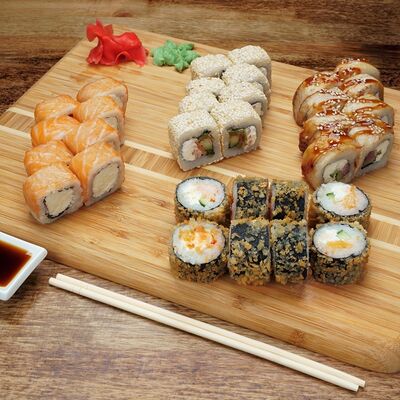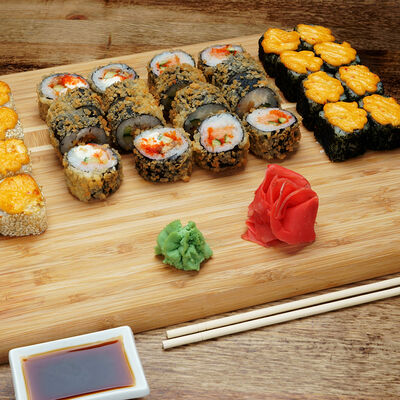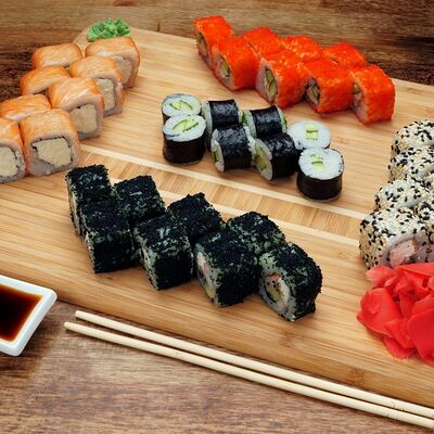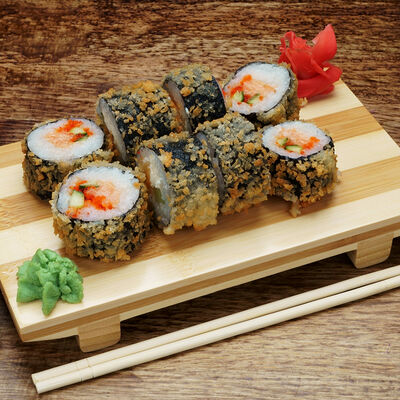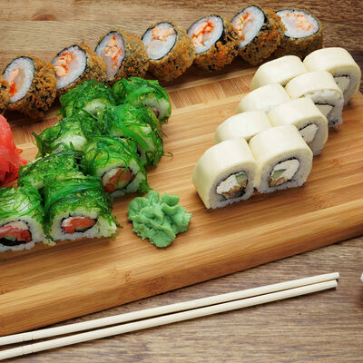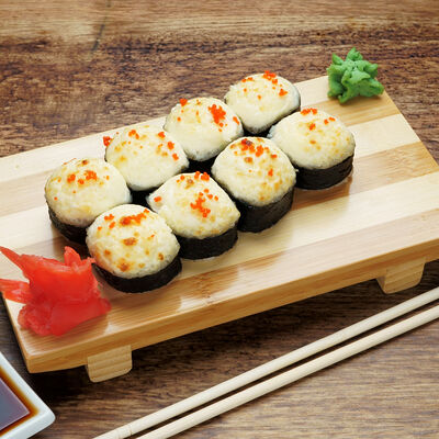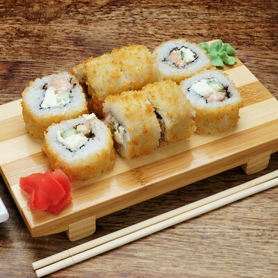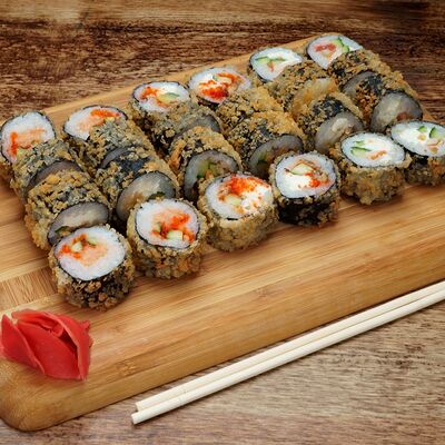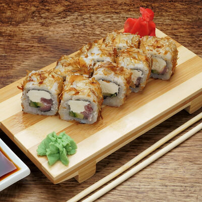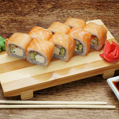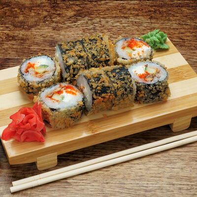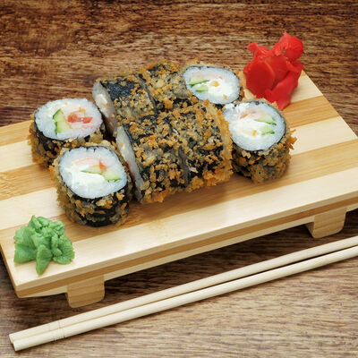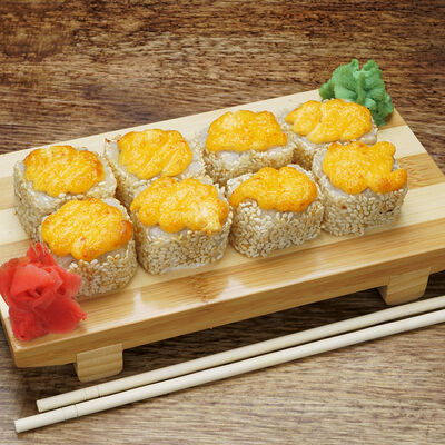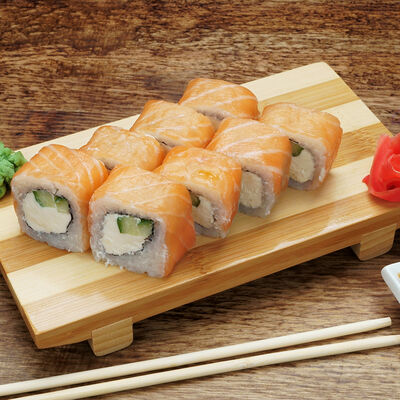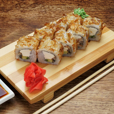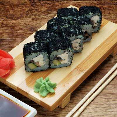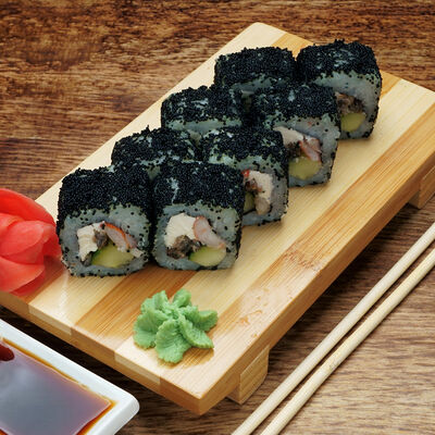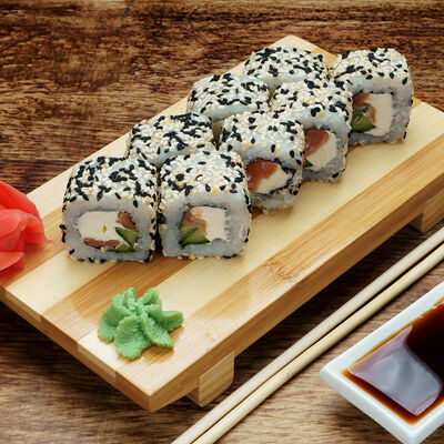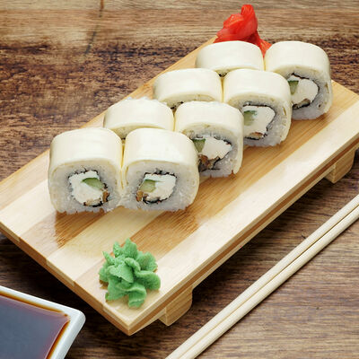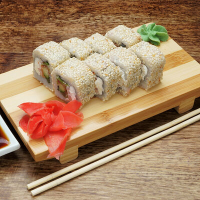 Рис, сливочный сыр, помидор, лист салата, огурец, курица, кунжут