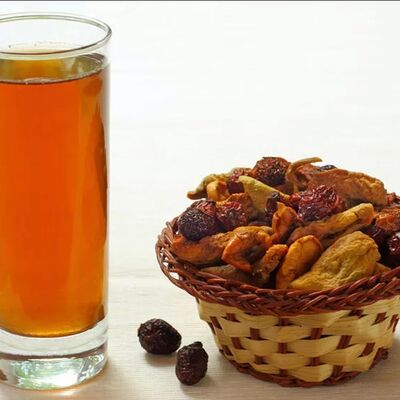 Сухофрукты (курага, яблоки, изюм, чернослив), вода, сахар. Напиток собственного приготовления