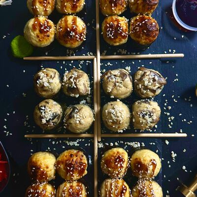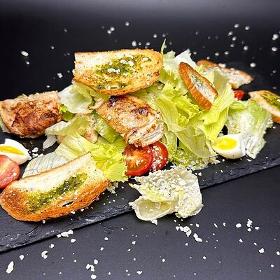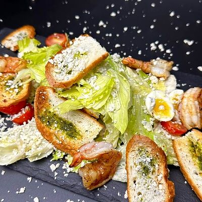 Хрустящие листья айсберга и романо, гренки с соусом песто, перепелиное яйцо, соус цезарь, черри, сыр пармезан, креветки, жаренные на гриле на пряном масле