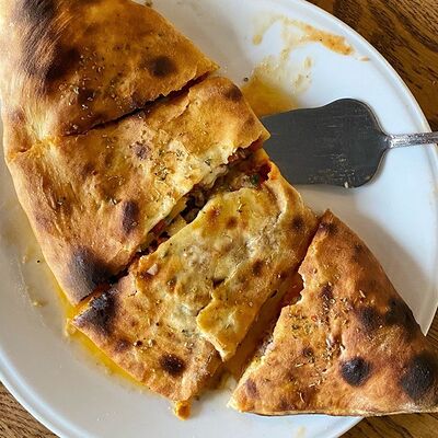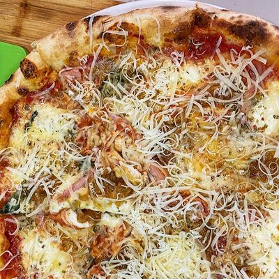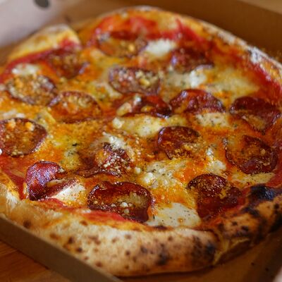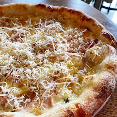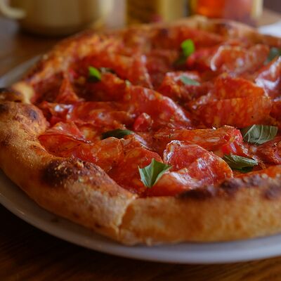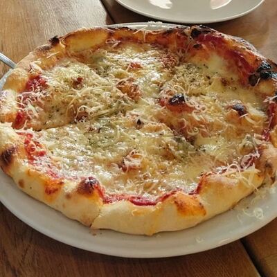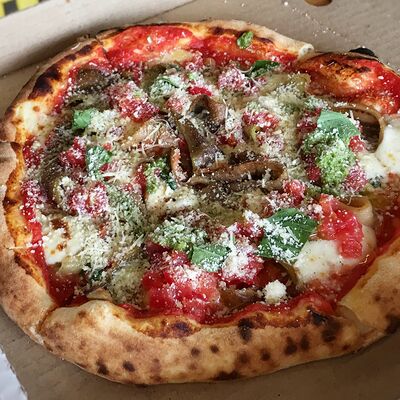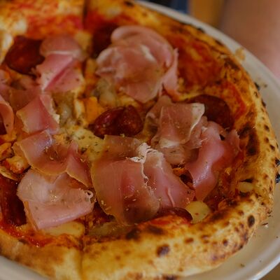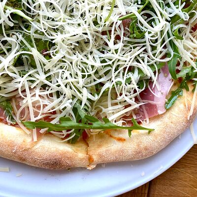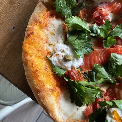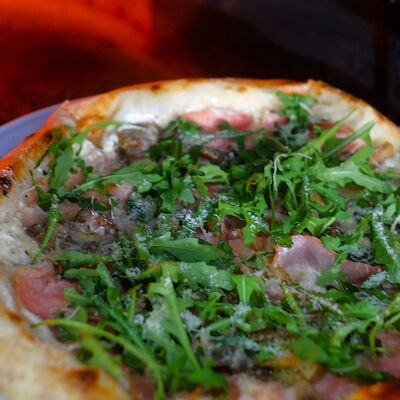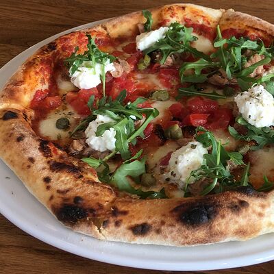 Фирменный соус, тунец, помидоры, сыр моцарелла, сыр рикотта, анчоусы, каперсы, руккола, оливковое масло (28 см)