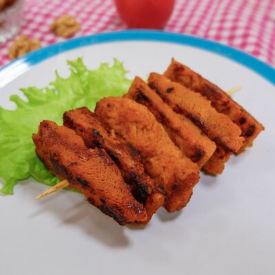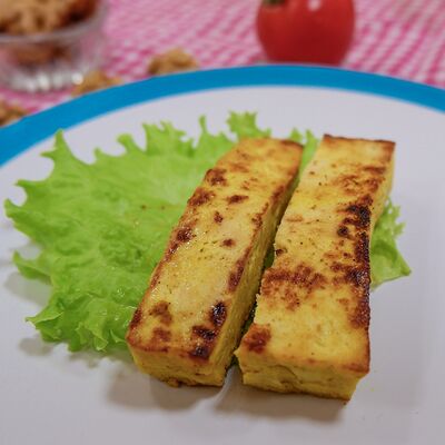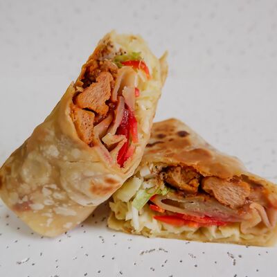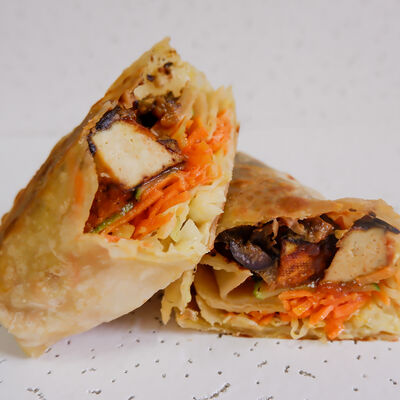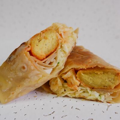 Лаваш, тофу карамельный, баклажан жареный, соус горчичный, соус томатный, капуста, морковь по-корейски, маринованные огурцы