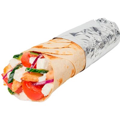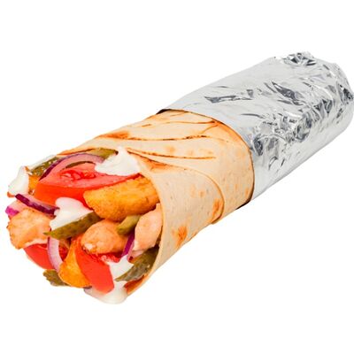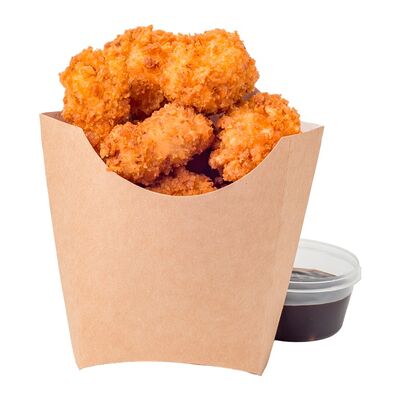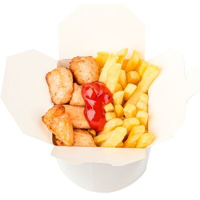 Картофель фри, кусочки сочного куриного мяса, микс из свежих овощей, лук, фирменный соус