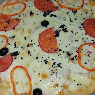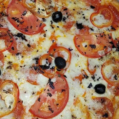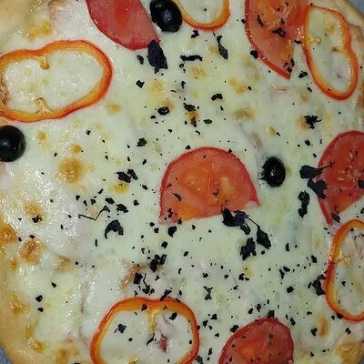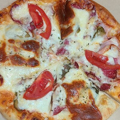 Тоник тесто, бекон, салями, пеперони, грибы, маслины, помидор, соус Афина, сыр гауда, орегано (28 см)
