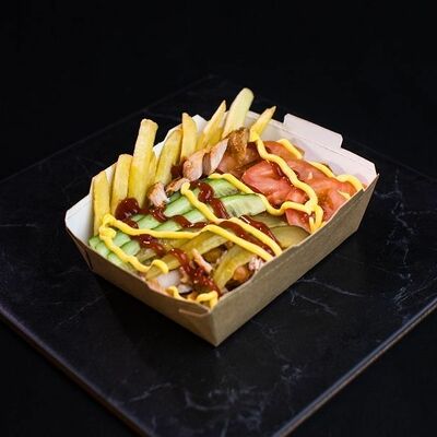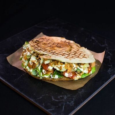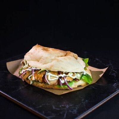 Лаваш сырный, курица маринованная, огурцы маринованные, соус чесночный, капуста свежая нашинкованная, соус томатный, лук красный, огурец свежий