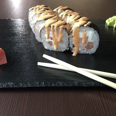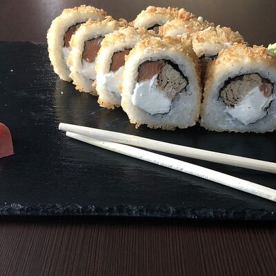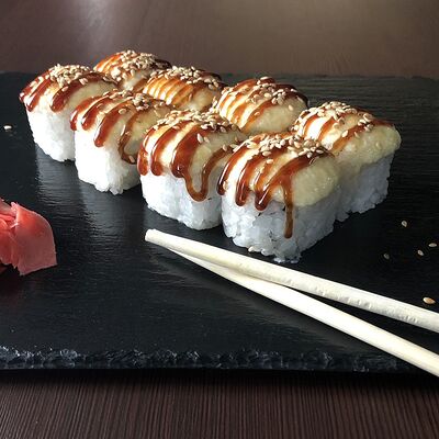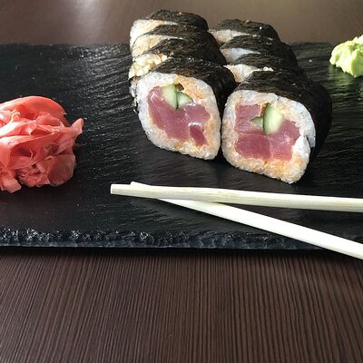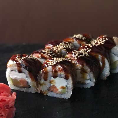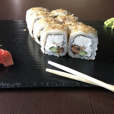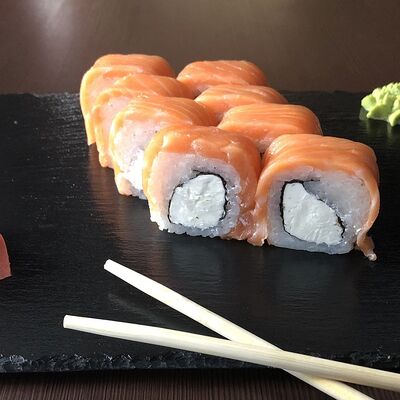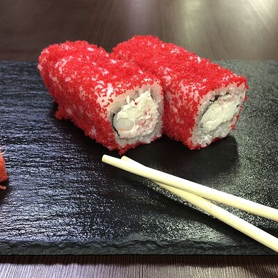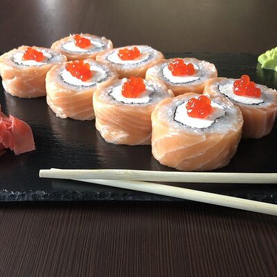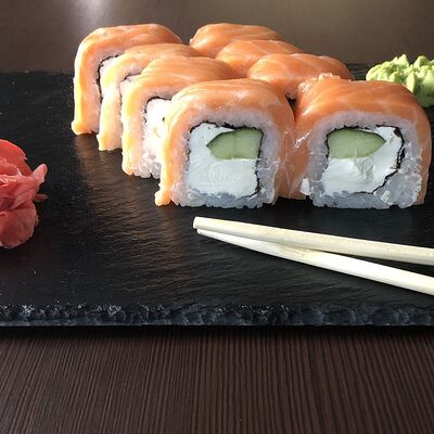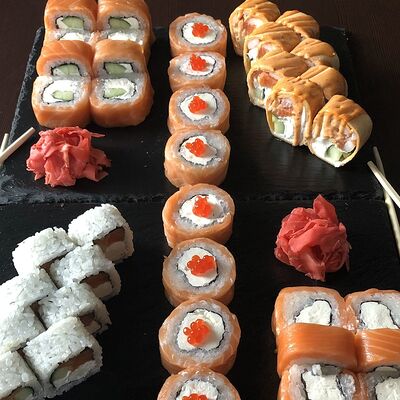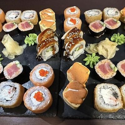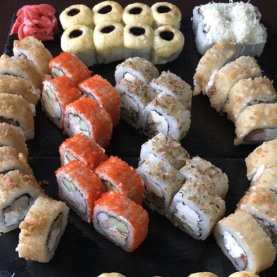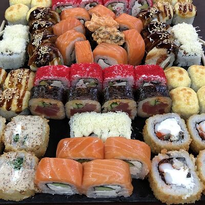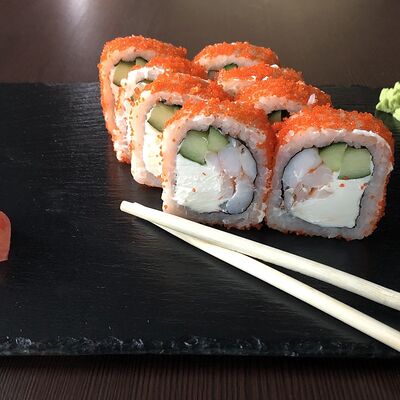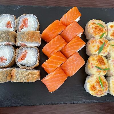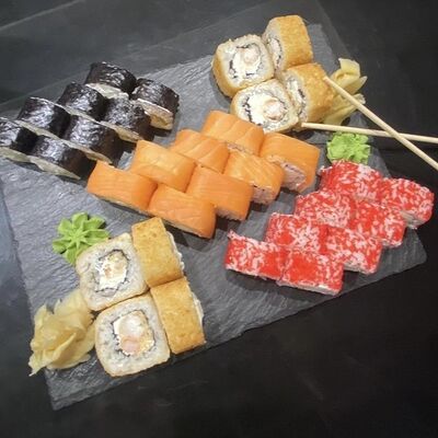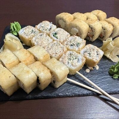 Темпурный ролл с креветкой (350гр), Филадельфия с огурцом (370гр), Чиз маки с огурцом (220гр), Аляска (300гр)