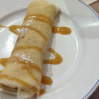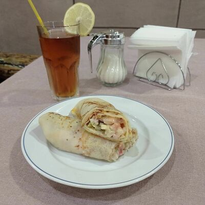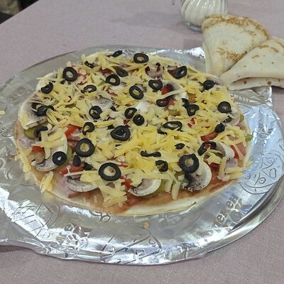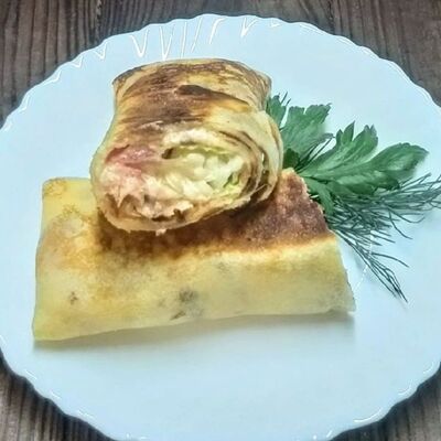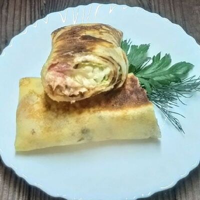 Блины, буженина куриная, огурец маринованный, помидор свежий, шампиньоны свежие, маслины, сыр твердый, соус томатный и брусничный