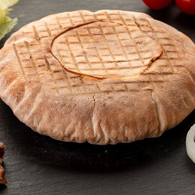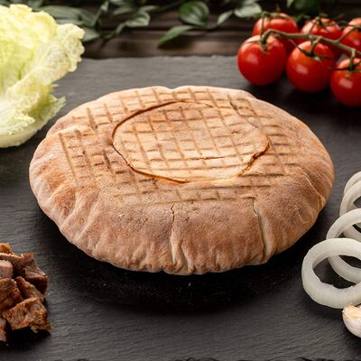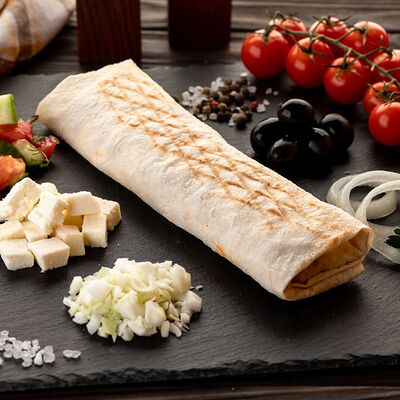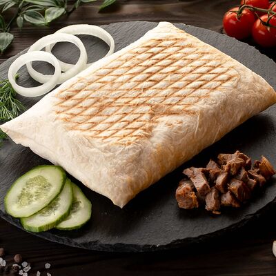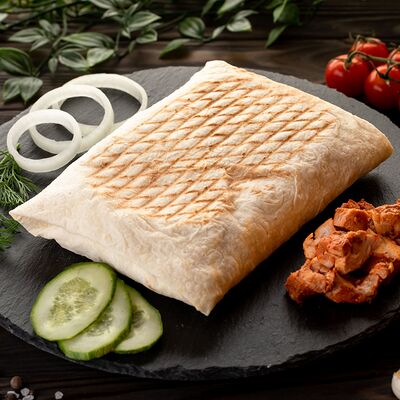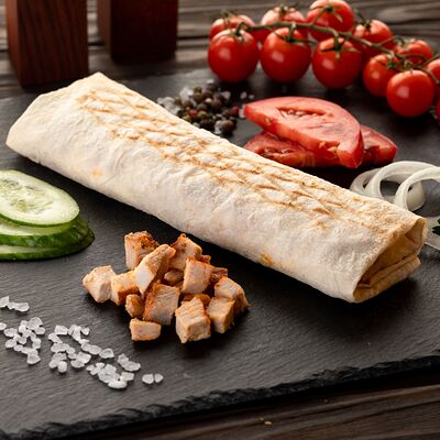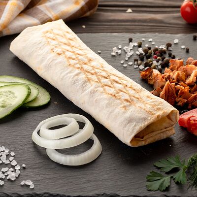 Бедро индейки без кожи, лаваш, помидоры, огурцы, зелень, лук, соус белый (сметано-чесночный), соус красный (на томатной основе)