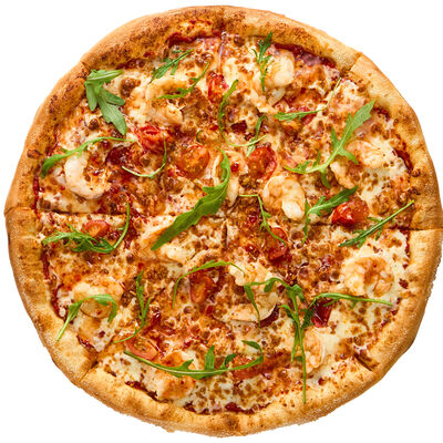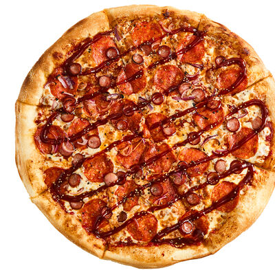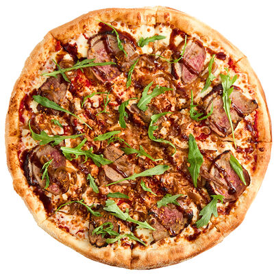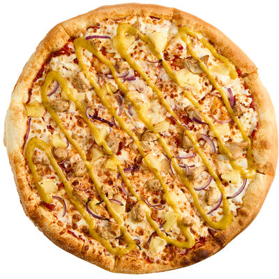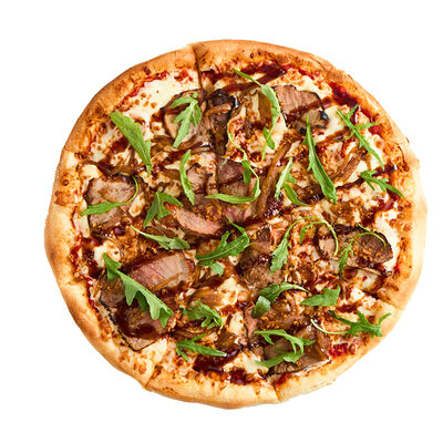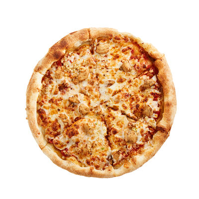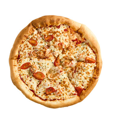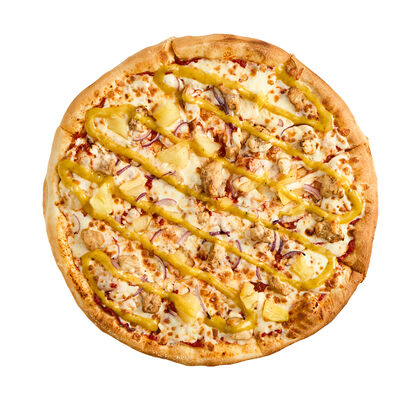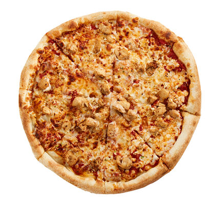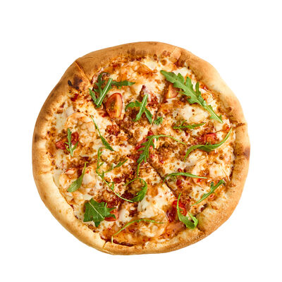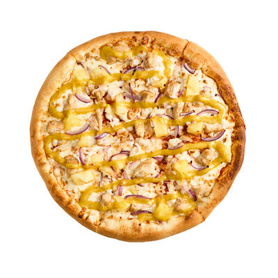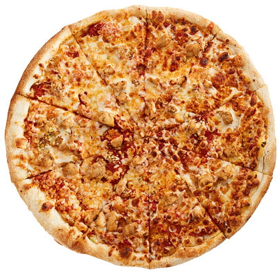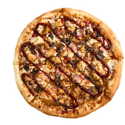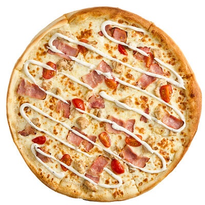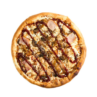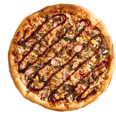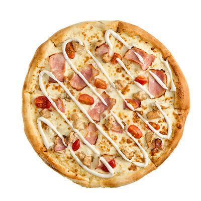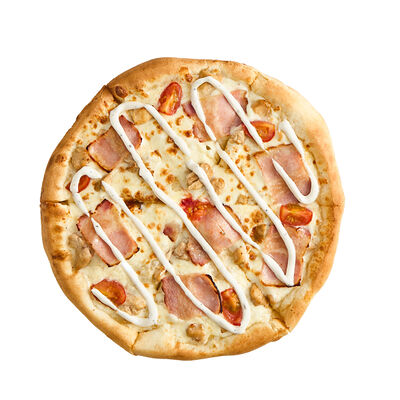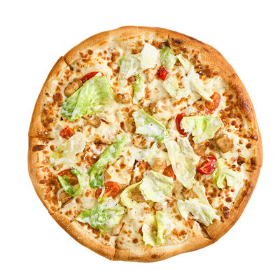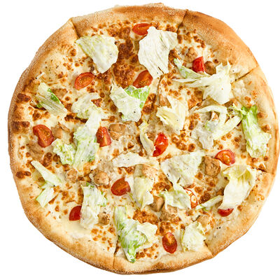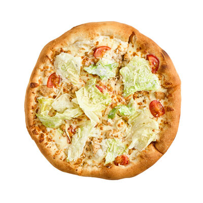 Курочка в соусе барбекю, сыр пармезан, томаты черри, салат айсберг и соус цезарь. 25 см