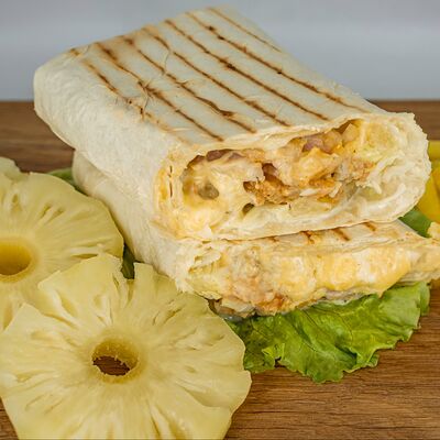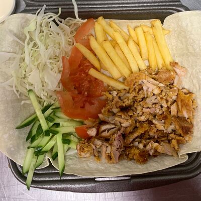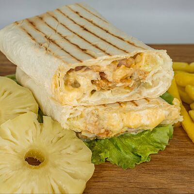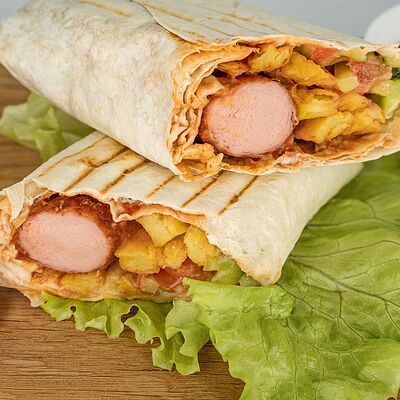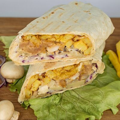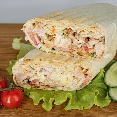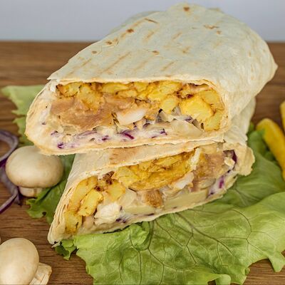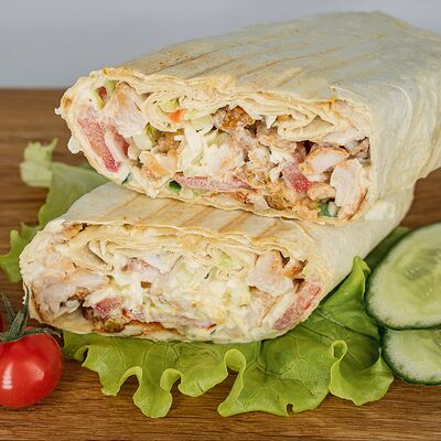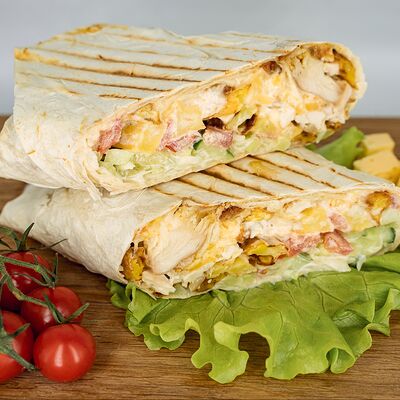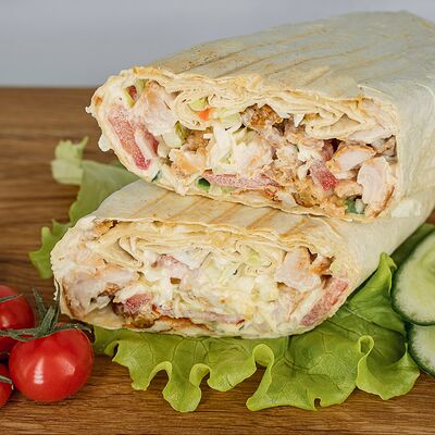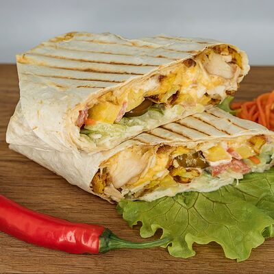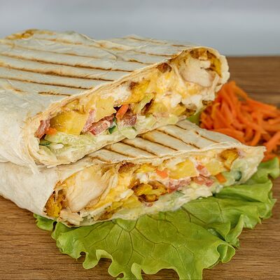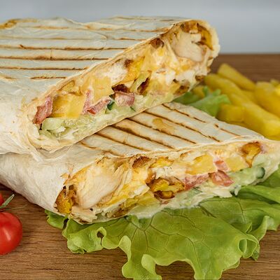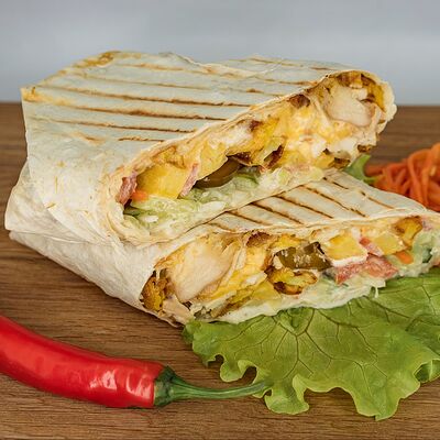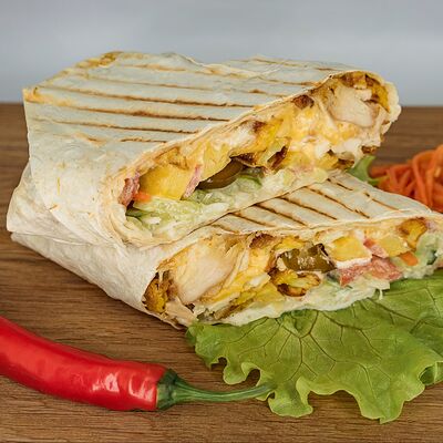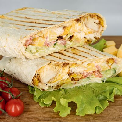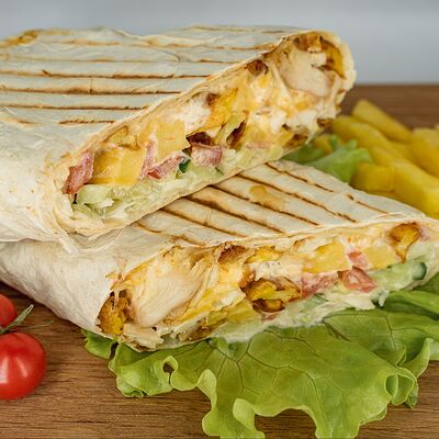 Лаваш, филе цыпленка, огурец, томаты, сыр голландский, капуста, картофель фри, соус