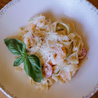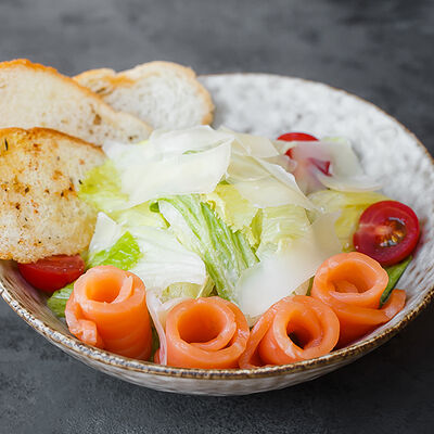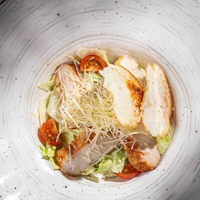 Креветки, салат айсберг, помидоры черри, хрустящие пшеничные гренки, пармезан, соус цезарь
