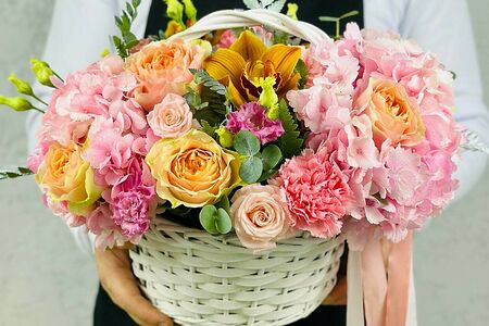 Состав: Гвоздика - 5; Роза пионовидная - 5; Орхидея - 3; Эвкалипт - 3; Роза мадам бомбастик - 3; Гортензия (Гидрангия) - 2; Папоротник - 2; Лизиантус (Эустома) - 1; Лента - 2; Флористическая губка - 2; Корзина - 1. Ширина: 35см. Высота: 25см.