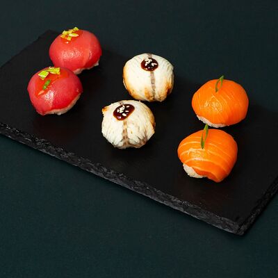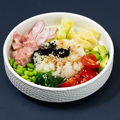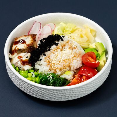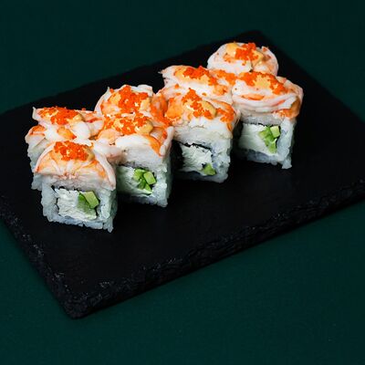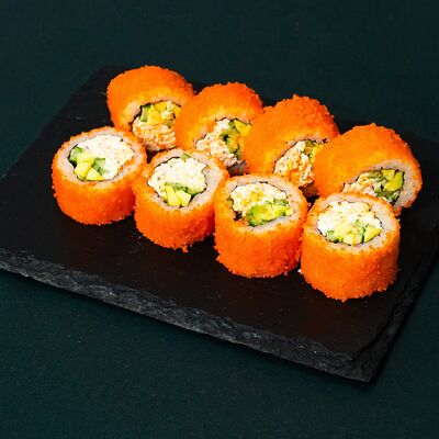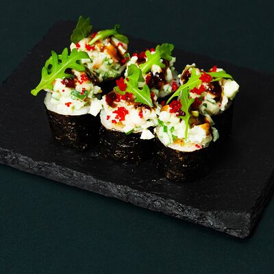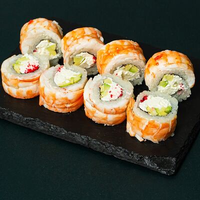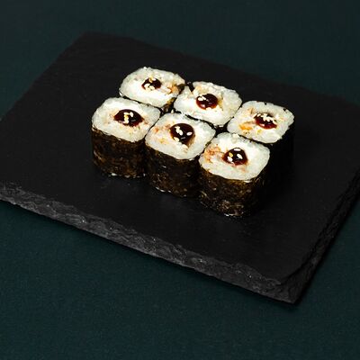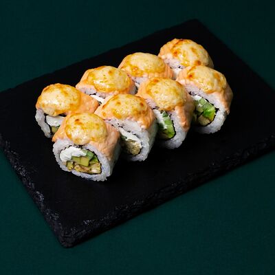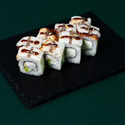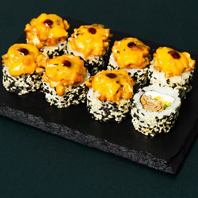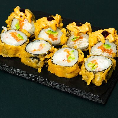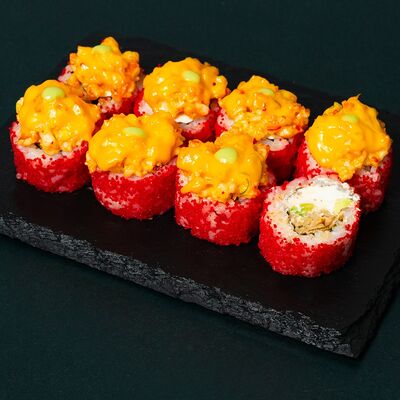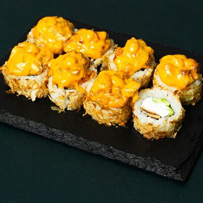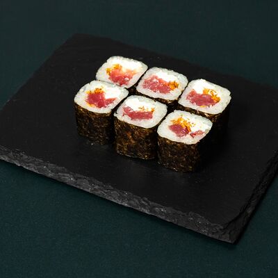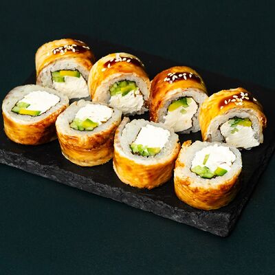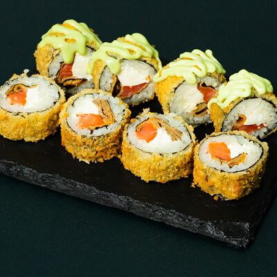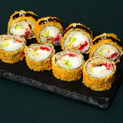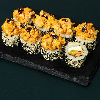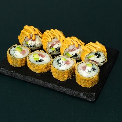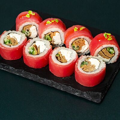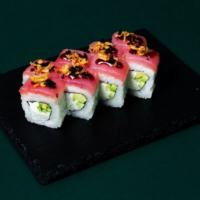 Рис, сыр Филадельфия, тунец, авокадо, соус унаги, лук фри, икра масаго и соус соевый 30мл