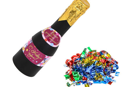 Пружинная хлопушка от Сноу Бум - это хлопушка в виде бутылки шампанского с толстыми пластиковыми стенками, внутри которой - поршень и пружина. Наполнитель - разноцветные блестящие ленточки из фольги. Высота 16 см.