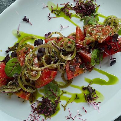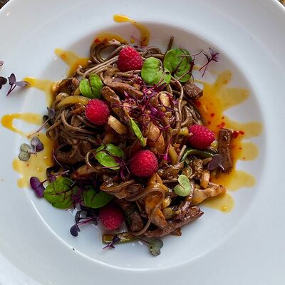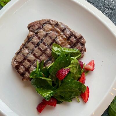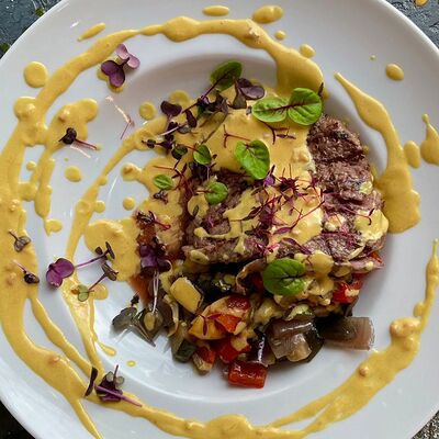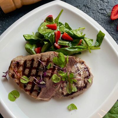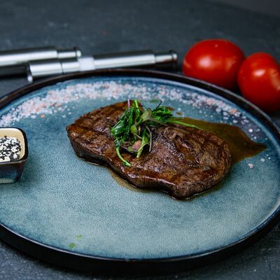 Ростбиф, картофельный драник, грибной соус, жареные вешенки и вяленые томаты