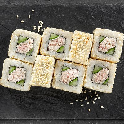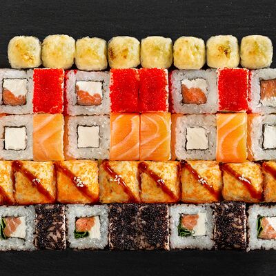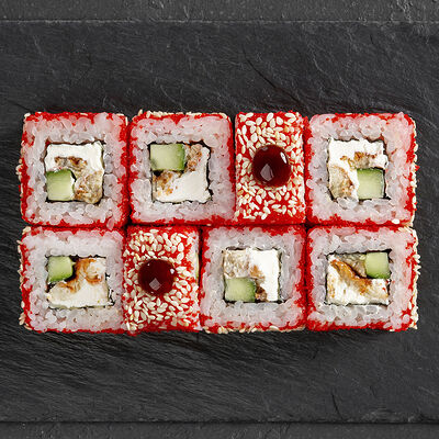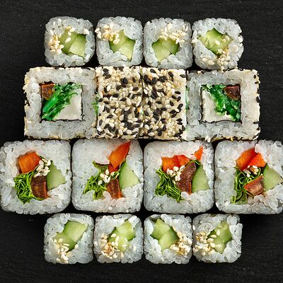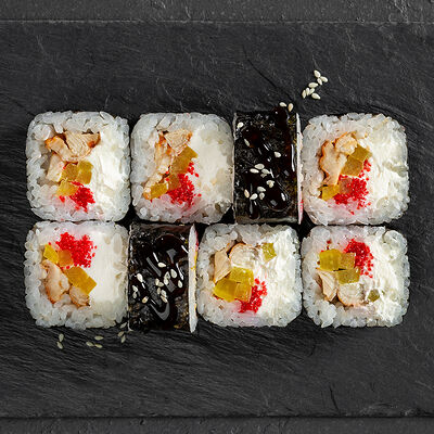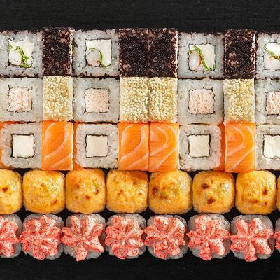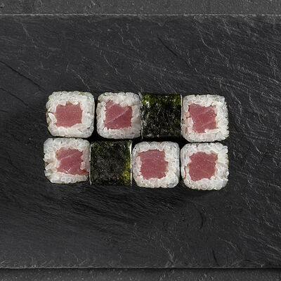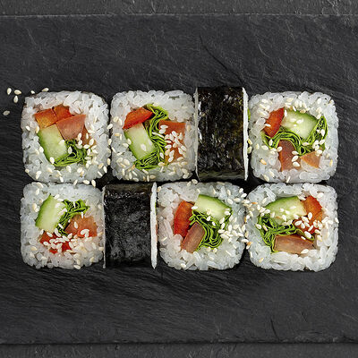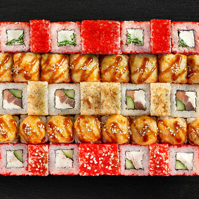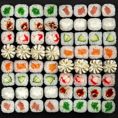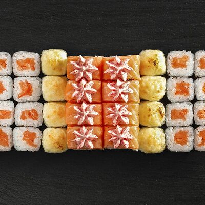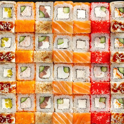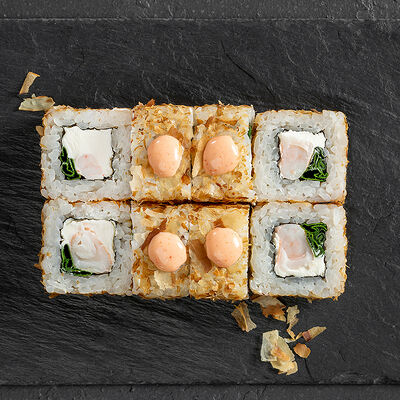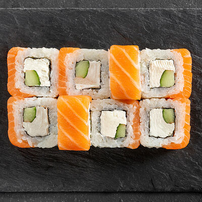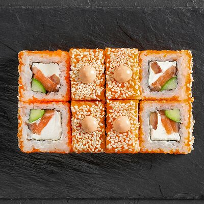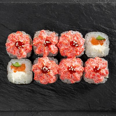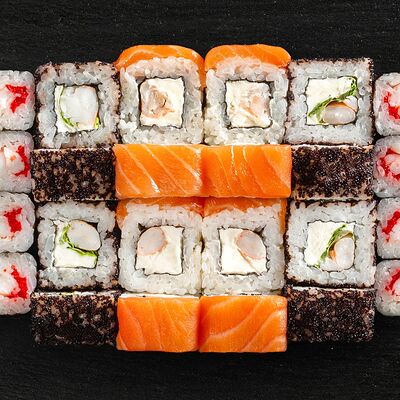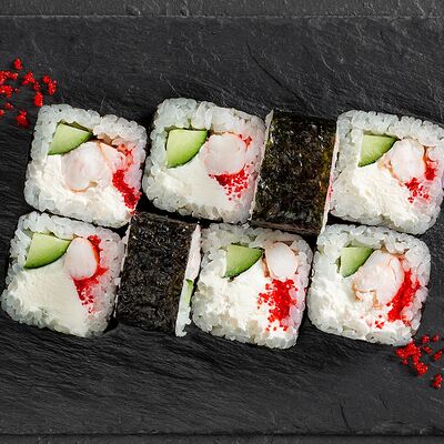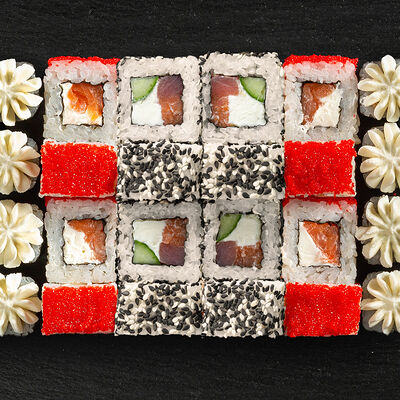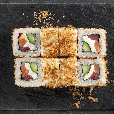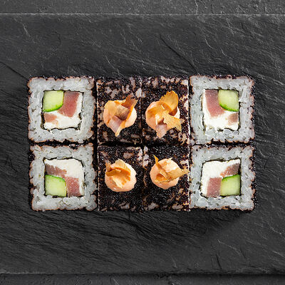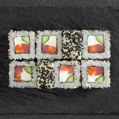 Рис, водоросли нори, сливочный сыр, тунец, лосось, огурец, стружка тунца