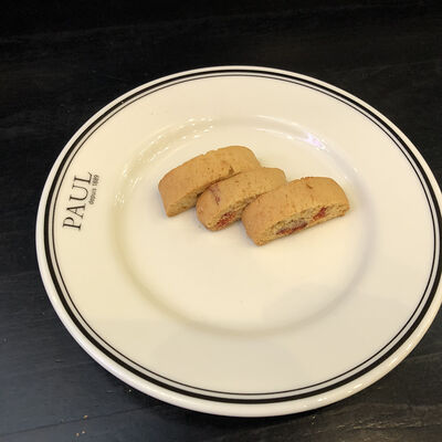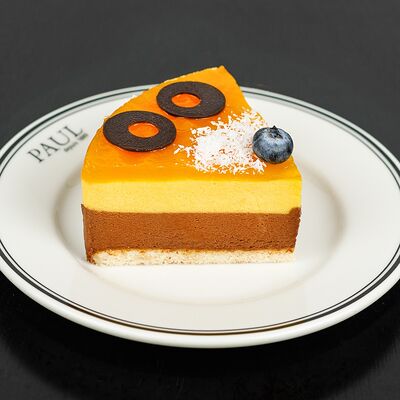Песочная основа, внутри миндальный крем с малиной, сверху блестящий фруктовый гель