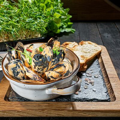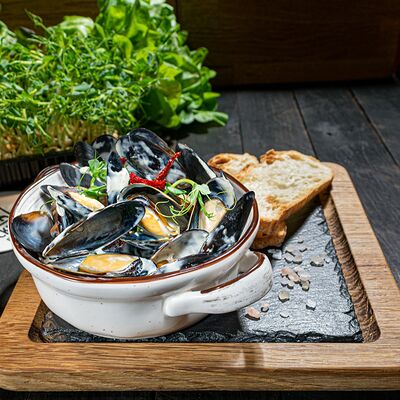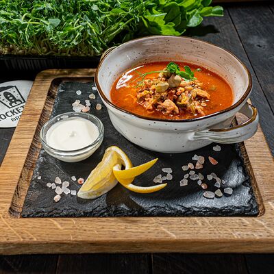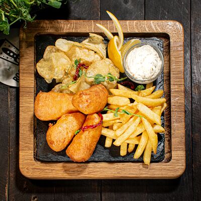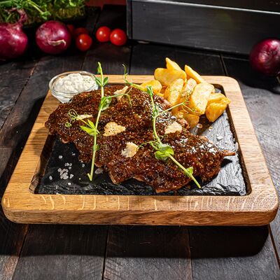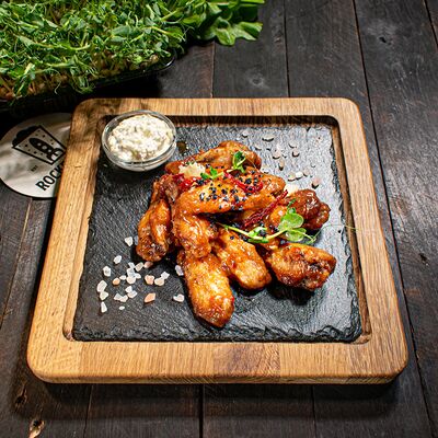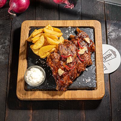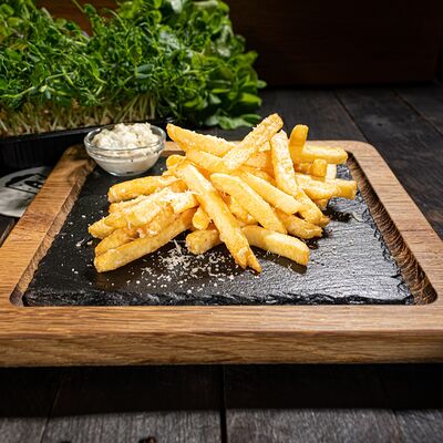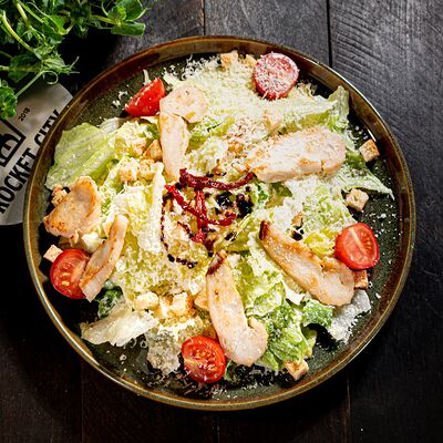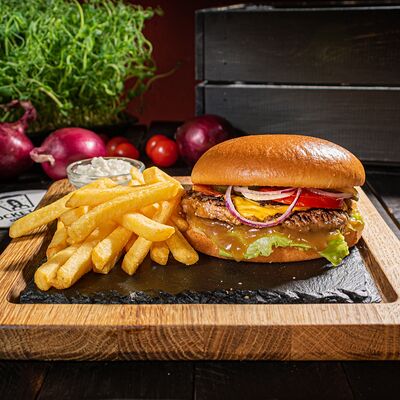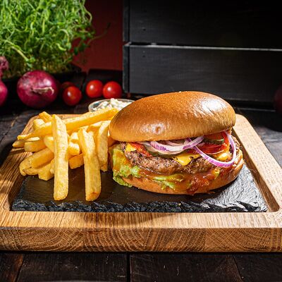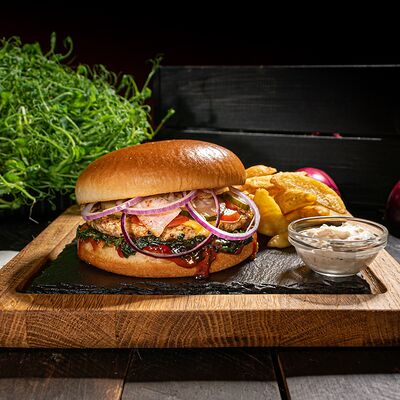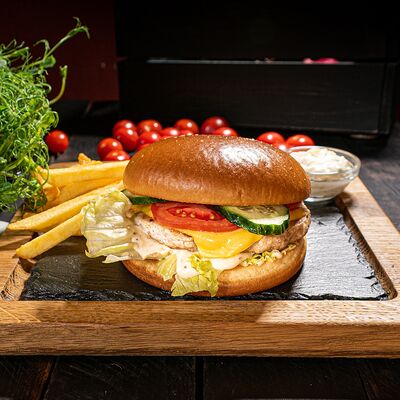 Бургер с сочной и нежной домашней куриной котлетой из бедра цыпленка. Булочка, домашняя куриная котлета, авторский соус Цезарь, помидоры, свежие огурцы, салат Айсберг, сыр Чеддер, соус Блю Чиз, картофель фри
