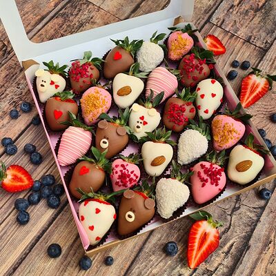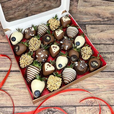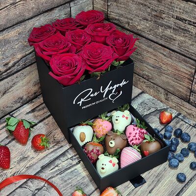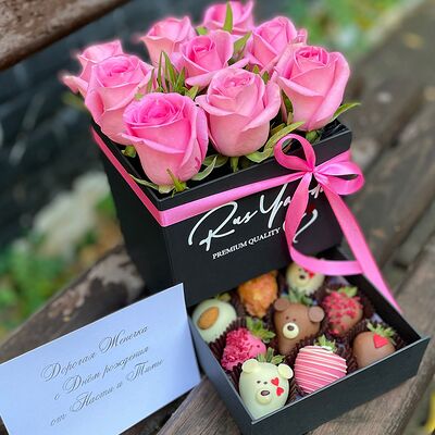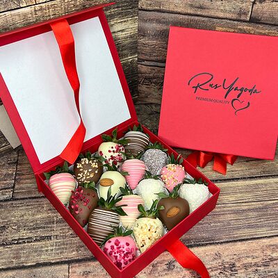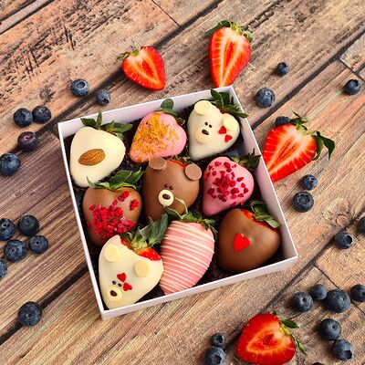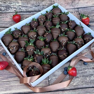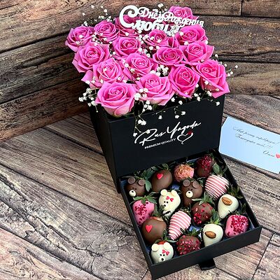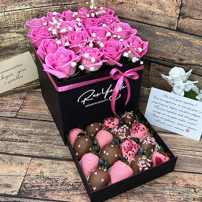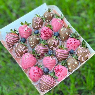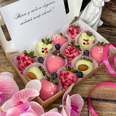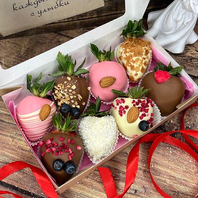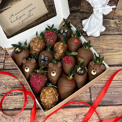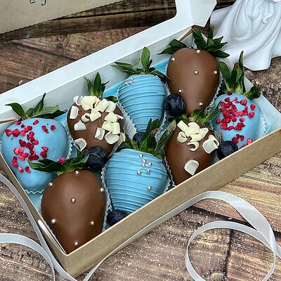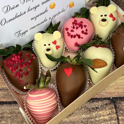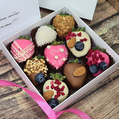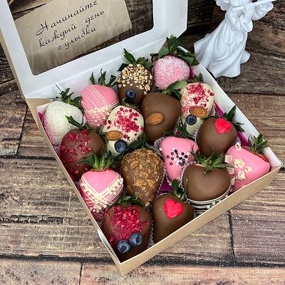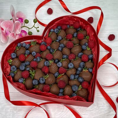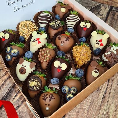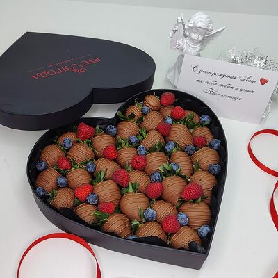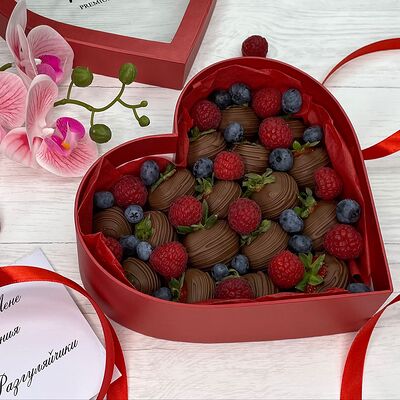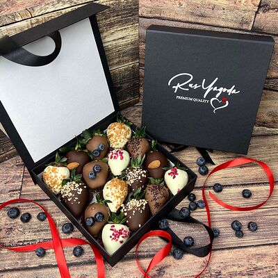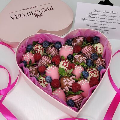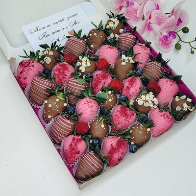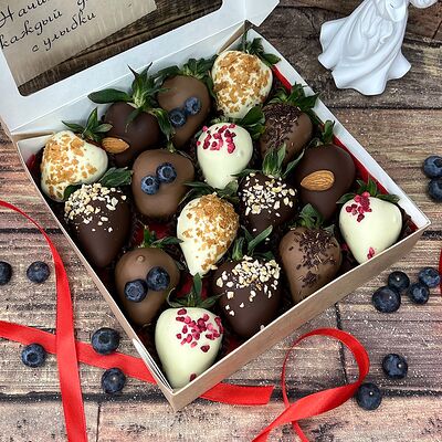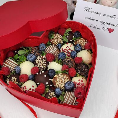 Клубника в бельгийском шоколаде, голубика, малина (30х30 см). Распечатаем текст вашего поздравления на открытке. Композиция будет упакована в прозрачную пленку для защиты при транспортировке